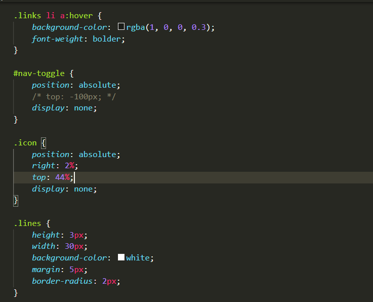 The reason of setting toggle -bar display to none so that we can it will remain hidden when user open the webpage in desktop. Hover effect works like this: