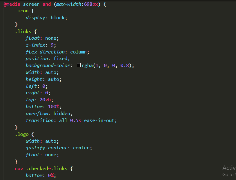 in the above code after reaching to 698px a bar icon appears and when you click on it the bottom becomes 0% and a drop down menu starts to show.