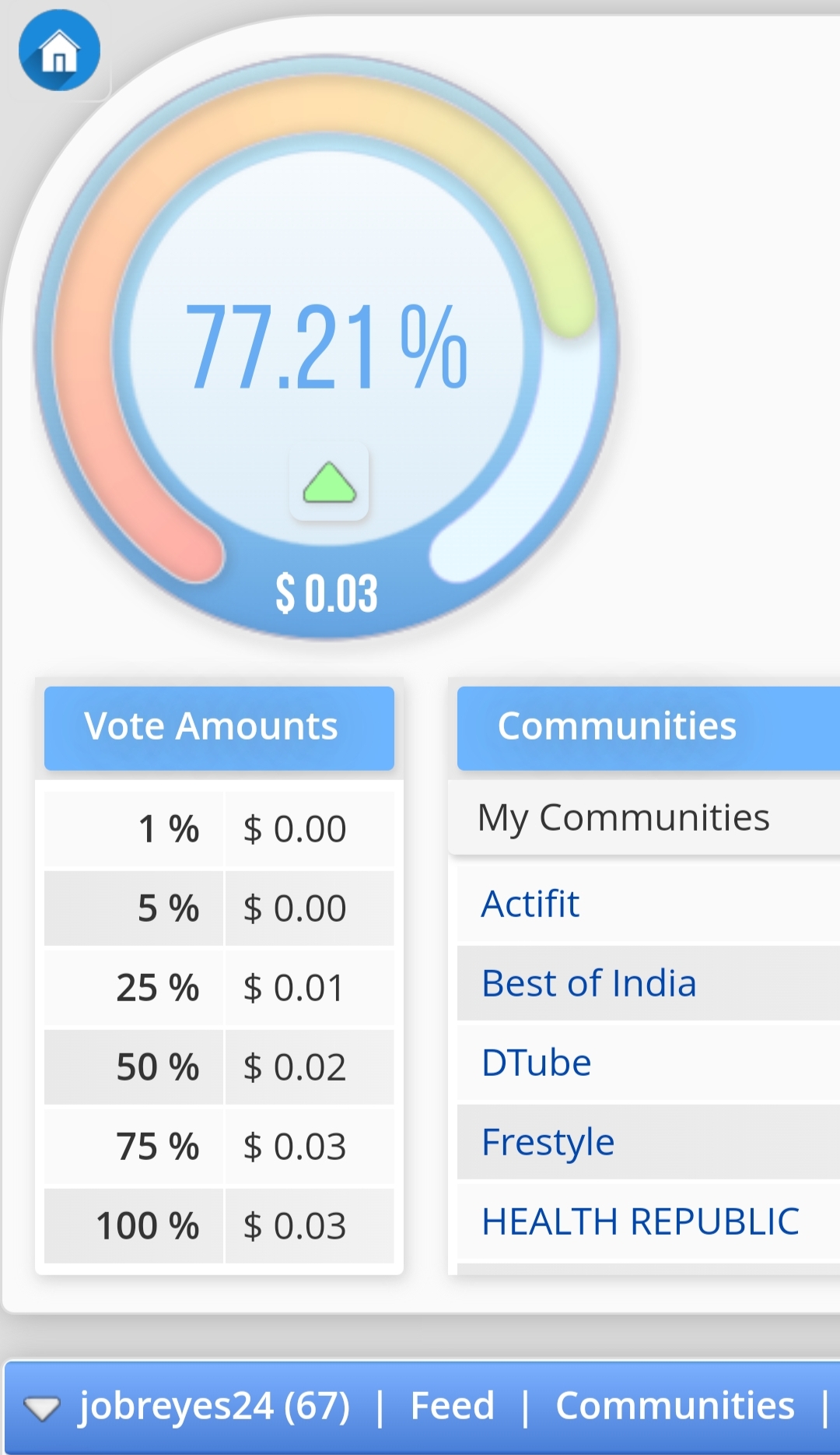 As of today my total accumulated SP is 5,575 plus 3000, minus 2000 SP outgoing delegation. My effective power is 6,555 SP. And my vote amount is $ .03 for a 100% vote.