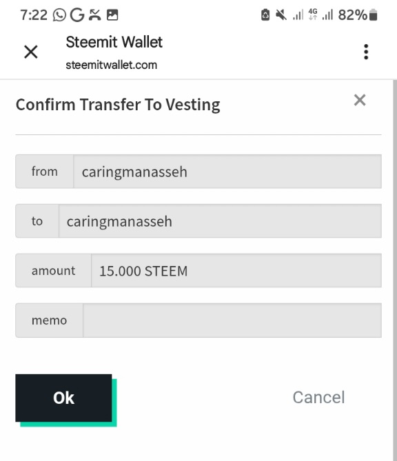 I first logged into my wallet, provided my username and posting key. After which I click the drop-down button in the Steem option. I selected power up and then input the amount of Steem I want to power up. I then click on the power-up button which takes me to another interface tagged confirm transfer to vesting. I clicked on ok on this interface and my 15 steem added up to steem power. See the images below: