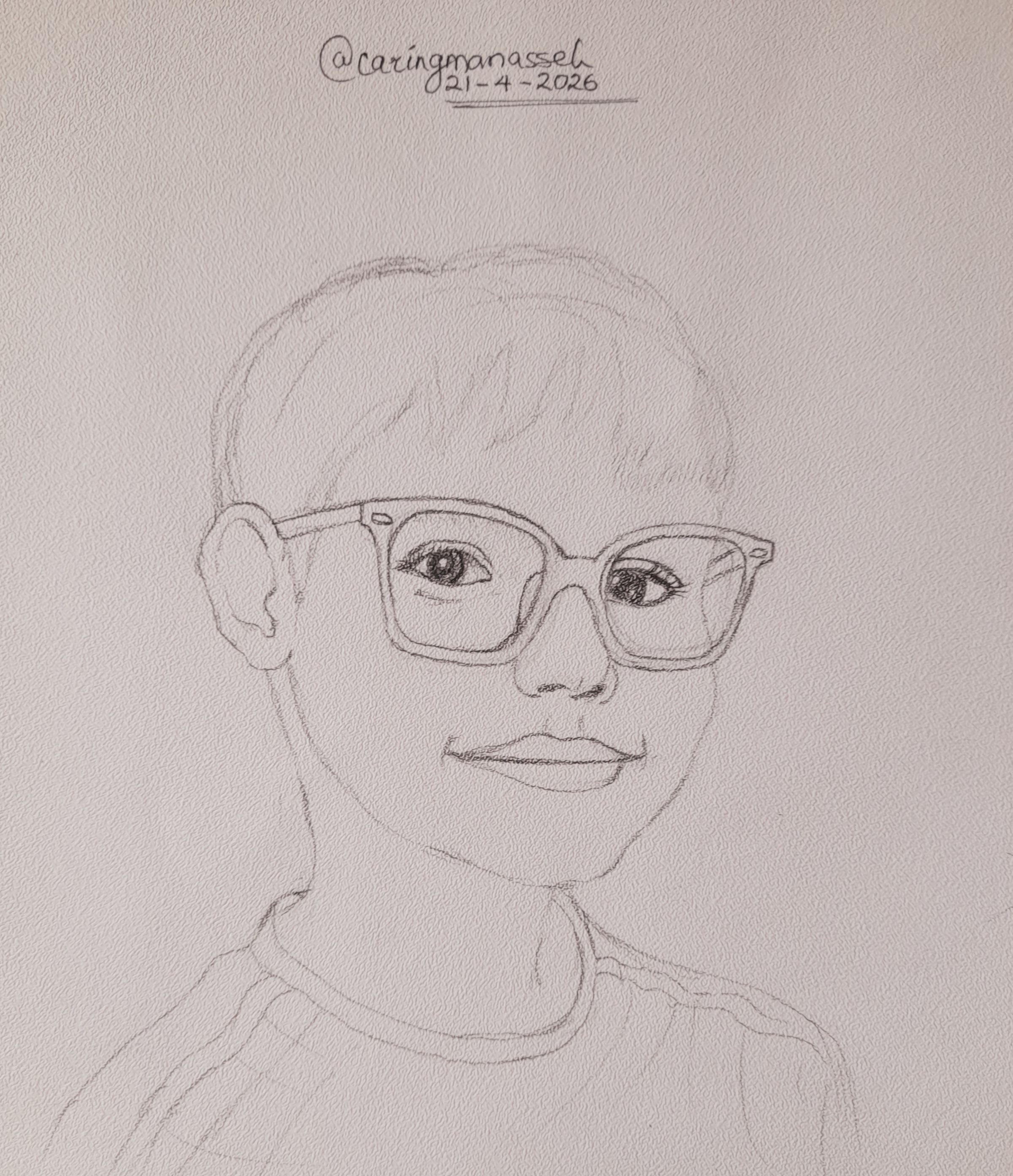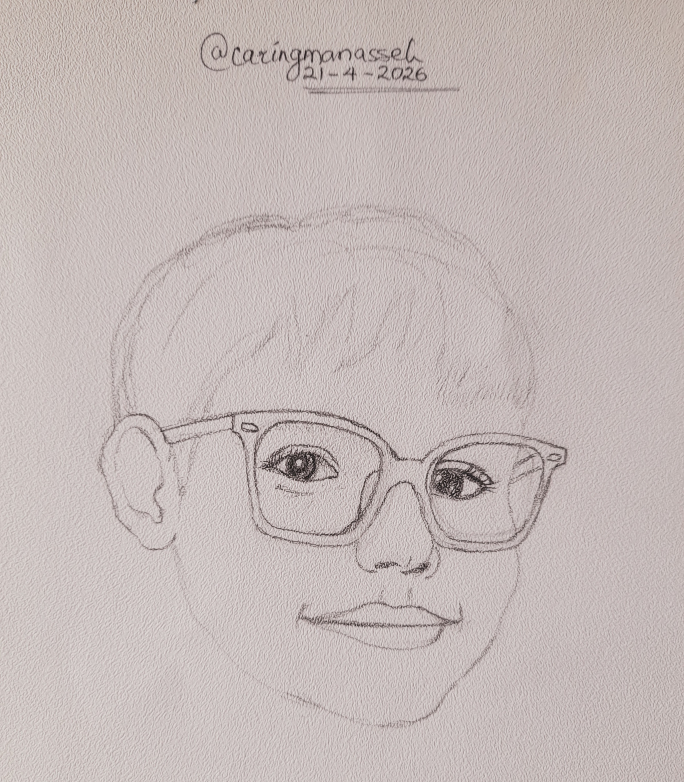 I sketched the entire face and head of the boy, beginning with the hair on the head. I drew his ear and the hands of the eyeglasses using an HB pencil.