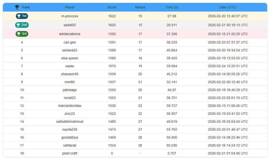 | Rank | User | Score | Moves | Time (s) | Prize | Entry Link |