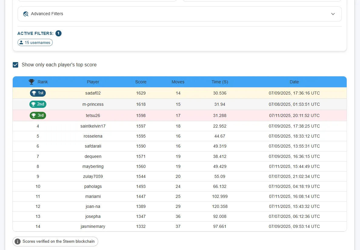 | Rank | User | Score | Moves | Time (s) | Prize | Entry Link |