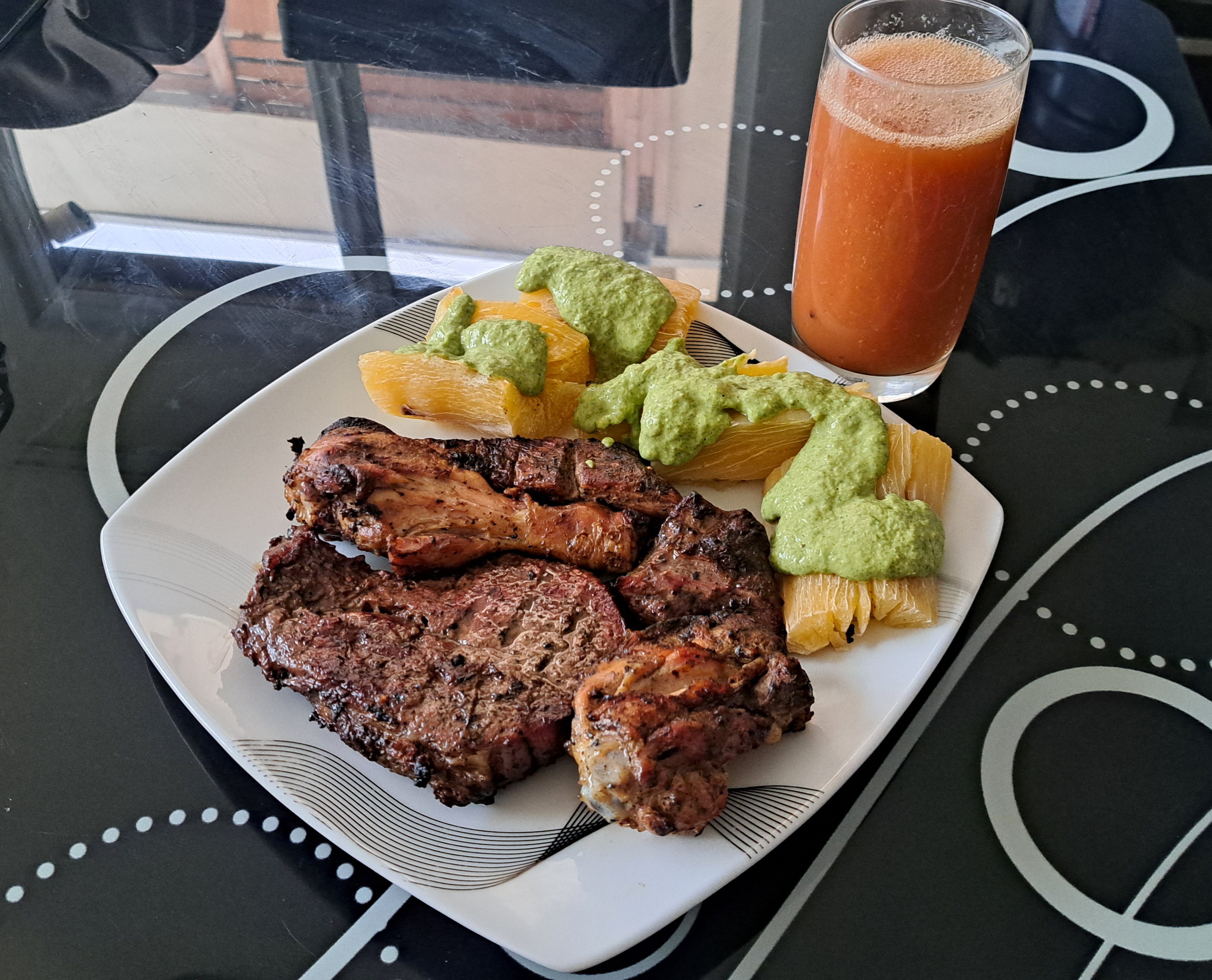 Como el día jueves mi hijo tenía poco trabajo decidimos colocar unas carnes al horno, así que para ello tomamos unos muslos de pollo y unos bistec de res, estos los adobamos como de costumbre y los llevamos al horno por 45 minutos, también pusimos yuca a sancochar, para acompañar esta parrillita hice una guasacaca muy saludable con huevos sancochados, cebolla, pimentón, cilantro, ajos, el zumo de un limón, este delicioso plato lo acompañe con un jugo de manzana con ciruelas, un almuerzo bien completo y nutritivo.