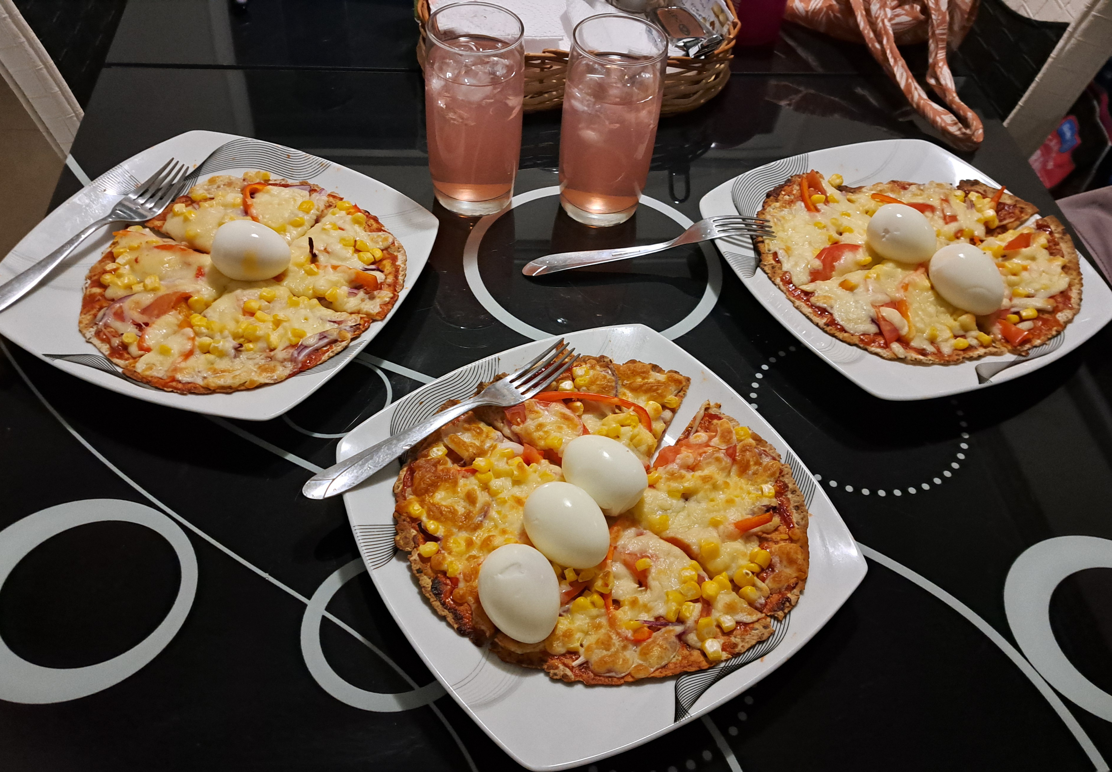 Para el día martes quisimos hacer una cena diferente, para ellos entre mi hijo y yo tomamos unas tortillas de masa integral y las hicimos tipo pizzas, a estas le colocamos salsa para pizza hecha en casa, también le colocamos tomate, cebolla, maíz 🌽, queso mozzarella y las llevamos al horno por 15 minutos y a la hora de servir las acompañamos con unos huevos sancochados y para tomar hicimos un delicioso jugo de fresa 🍓, una cena rápida, práctica y muy deliciosa.