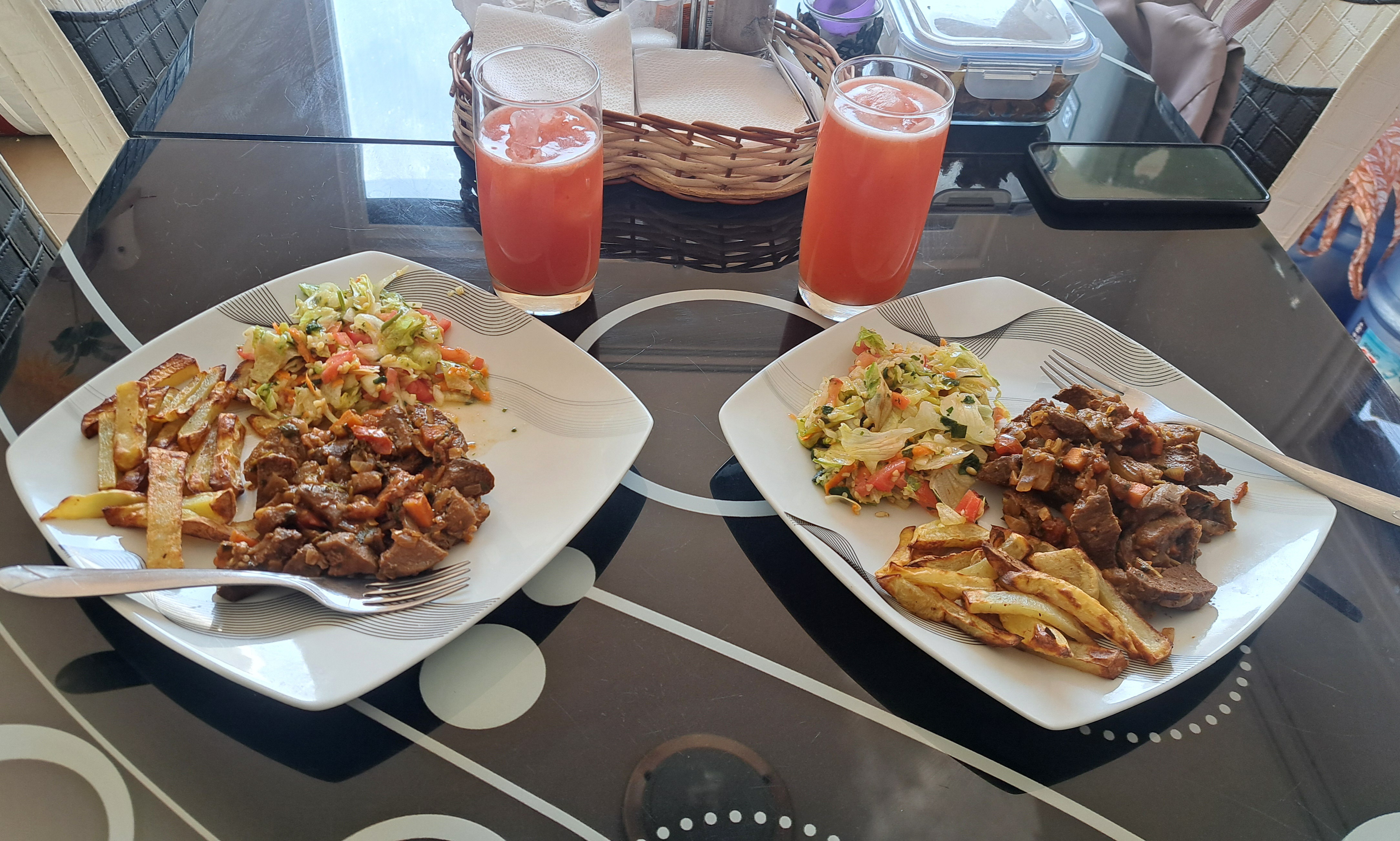 Para el día miércoles tomé unos bistec que tenía en la nevera los corte en cuadritos los llevé a la sartén bien adobados con ajo, paprika, pimienta y sal al gusto, luego que estuvieron dorados, les agregué tomate, cebolla, y dos papas picaditas, ahí los dejé cocinar por unos minutos, este increíble almuerzo lo acompañé con papas al horno, y una ensalada con lechuga, tomate, pepino y cilantro picadito, y para tomar realice un jugo de fresa con limón 🍋, un almuerzo bien completo saludable y nutritivo.