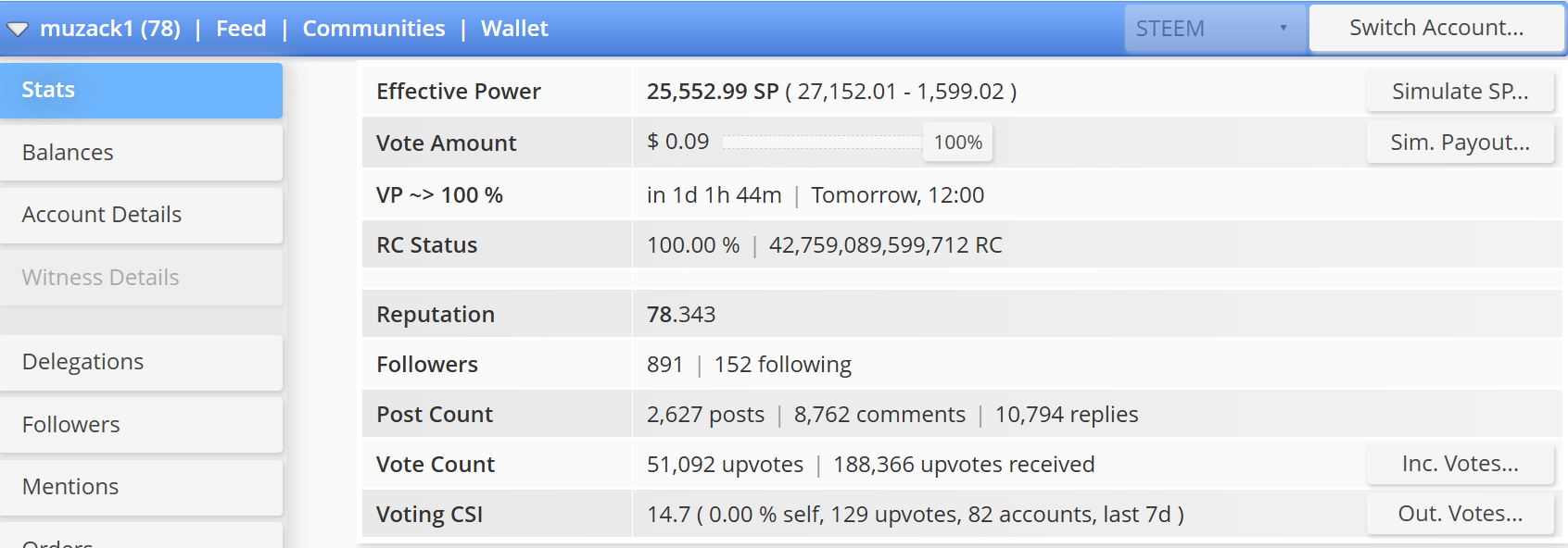 I am currently at reputation 78,343 with steempower I have 27,152.01 which was delegated as much as 1,599.02, and the steem power I have after being delegated is 25,552.99. The current CSI is 14.7 (0.00% self, 129 upvotes, 82 accounts, last 7d).