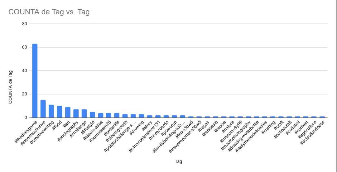 Our team has attempted to cover every tag with quality content, resulting in a curated list of 36 tags. Notably, The Diary Game ranks first, Steem Exclusive second, and Creative Writing third.
