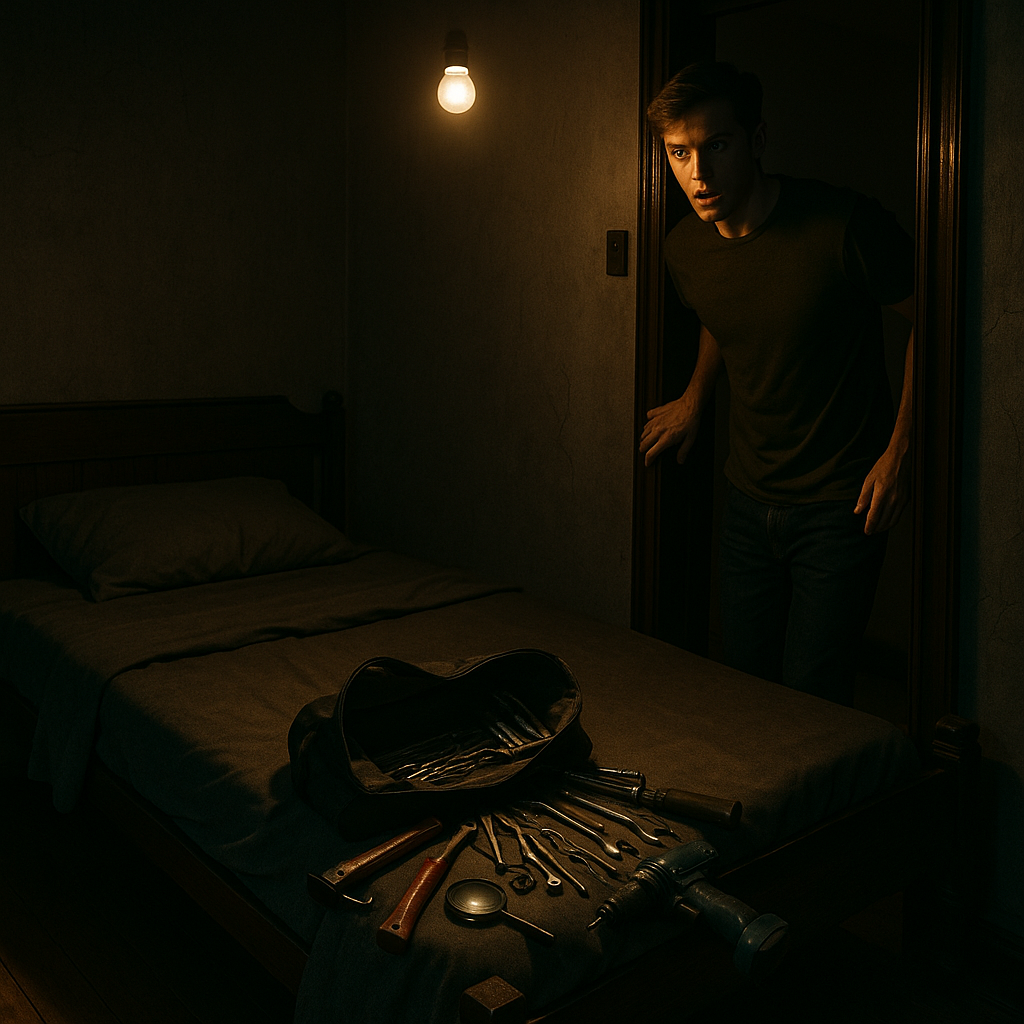 So Timothy didn’t expect to come home one night to find him crouched under the bed, pulling out a worn black bag. Inside: saws, drills, a bunch of keys, and a small gun that gleamed under the dim bulb.