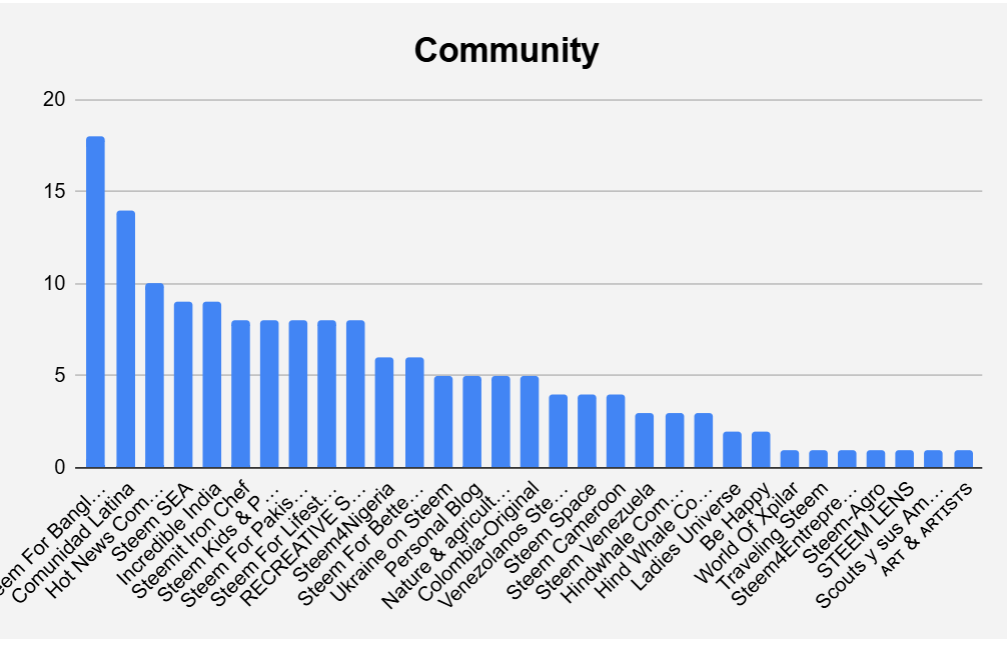 This week, we reached 37 communities and personal blog. Steem For Bangladesh led the way in the third week with 18 posts, and at least one post comes from the communities: STEEM LENS, Scouts y sus Amigos, ᴀʀᴛ & ᴀʀᴛɪꜱᴛꜱ, etc
