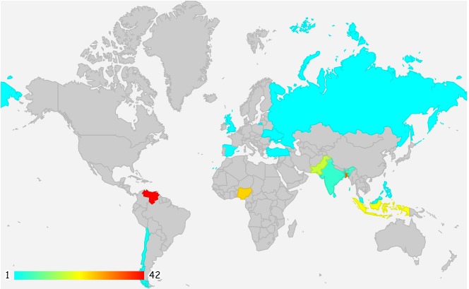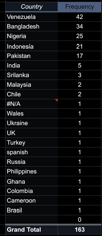 During this week, the team visited a total of 20 countries and 1 country as N/A. Venezuela at the top of the list, followed by Bangladesh and Nigeria respectively.