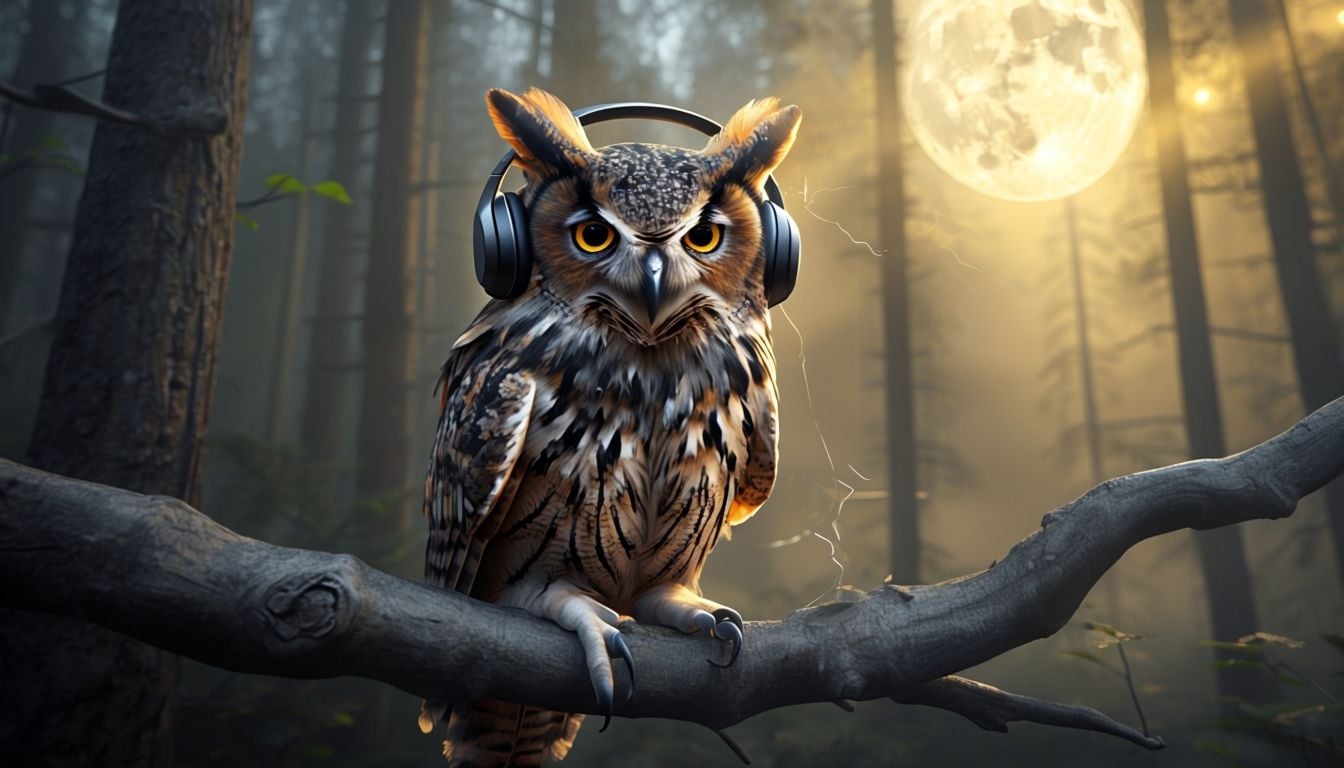 "Replicate the reference image exactly, same owl pose, same background, same lighting and expression, but with the owl now wearing sleek, modern over-ear headphones. The headphones should blend naturally with the owl’s head, designed in a minimalist tech style, subtle but clearly visible. Preserve the original mood and tone of the image. Realistic illustration."