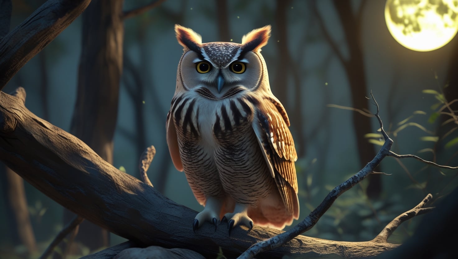 "A hyper-realistic owl perched on a wooden branch, intelligent and wise expression in its eyes, feathers detailed with soft browns and grays, subtle glow in the background suggesting a moonlit forest. The owl looks smart and curious, with a slight head tilt as if it's listening or thinking. Natural lighting, cinematic depth of field, ultra-detailed textures, realistic wildlife photography style."