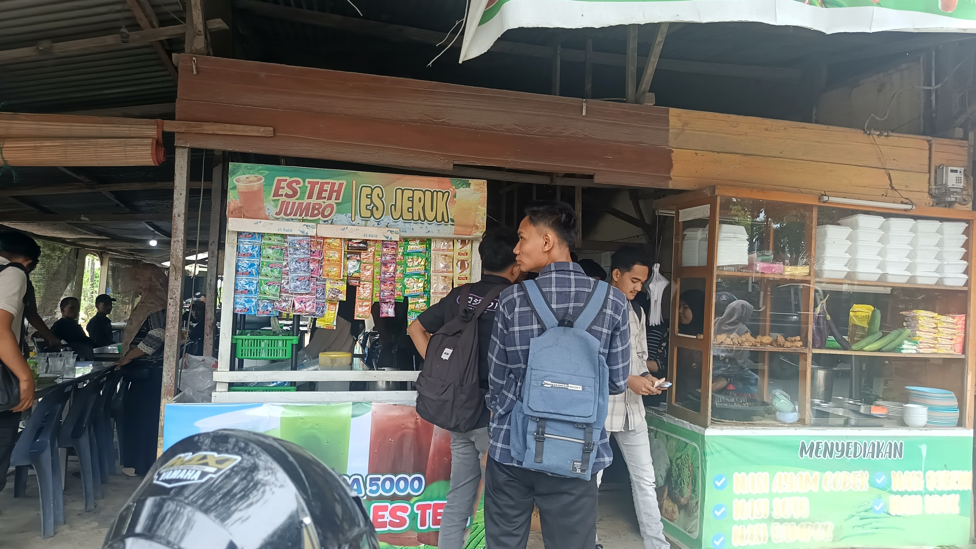 Setibanya di kantin ternyata suasananya sudah ramai, ini beda dengan hari-hari sebelumnya sebelum libur di mana Suasana Hari ini sudah dipenuhi oleh mahasiswa baru. Kami menandakan mahasiswa baru dari rambutnya yang pendek ataupun botak adalah mengikuti pkkmb. Untung saja ada satu meja yang masih kosong dan bisa kami duduki bersama. Aku sendiri memesan satu porsi nasi geprek dengan minuman es kosong, dan teman-temanku ada yang memesan nasi geprek dan ada yang memesan nasi goreng sesuai dengan selera dan pilihannya masing-masing. Harga satu porsi nasi hanya Rp10.000.