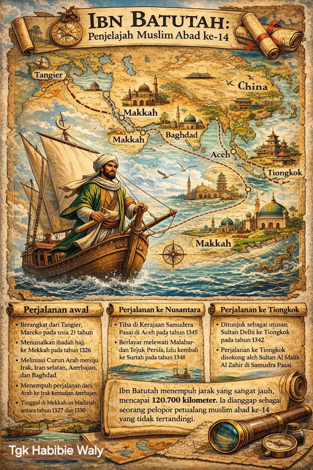 Nama Ibnu Batutah tidak hanya tercatat sebagai pengembara terbesar dalam sejarah Islam, tetapi juga sebagai saksi hidup kejayaan Aceh pada abad ke-14. Dalam catatan perjalanannya, Aceh yang saat itu dikenal sebagai Samudera Pasai bukanlah negeri pinggiran, melainkan simpul penting peradaban Islam dunia.