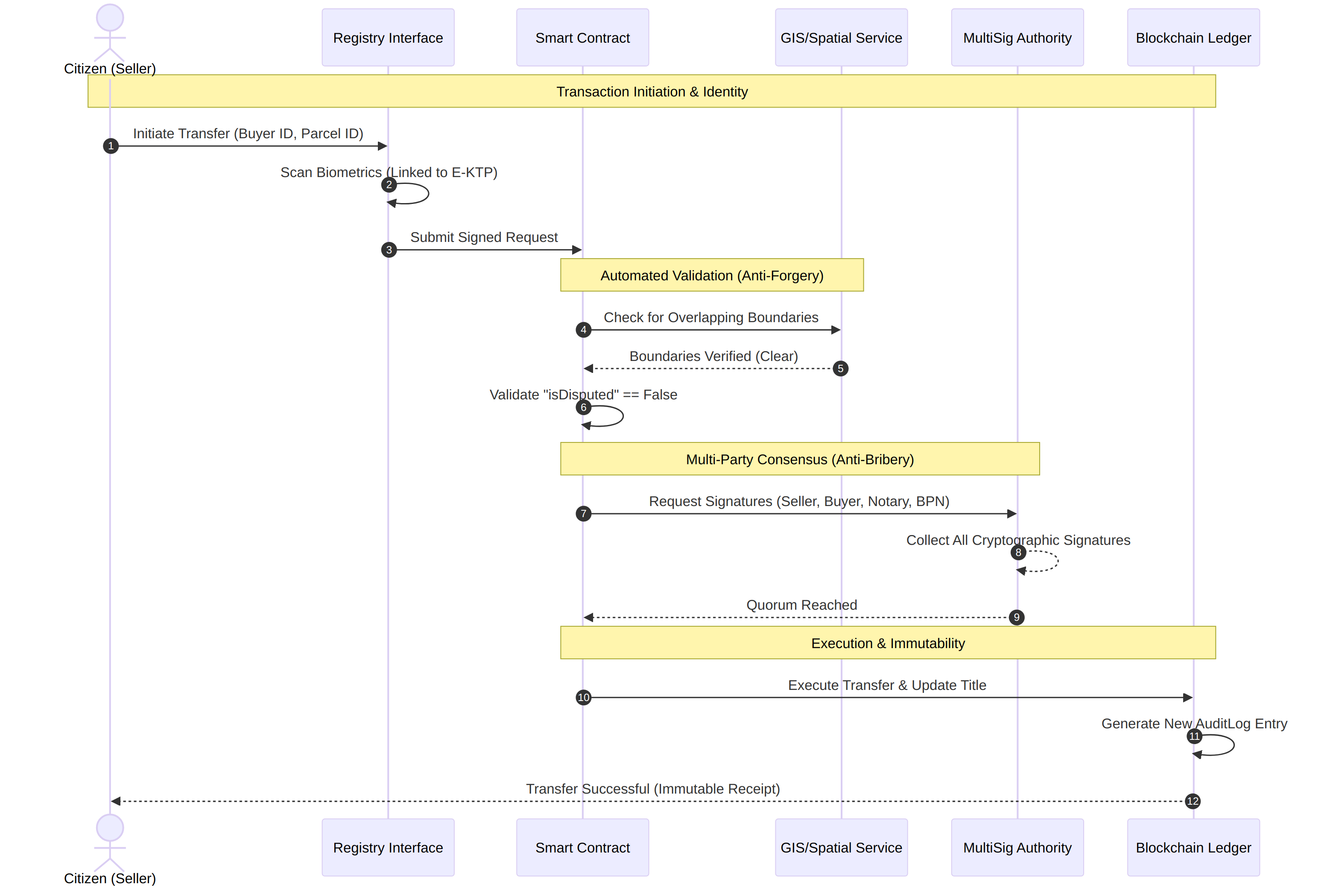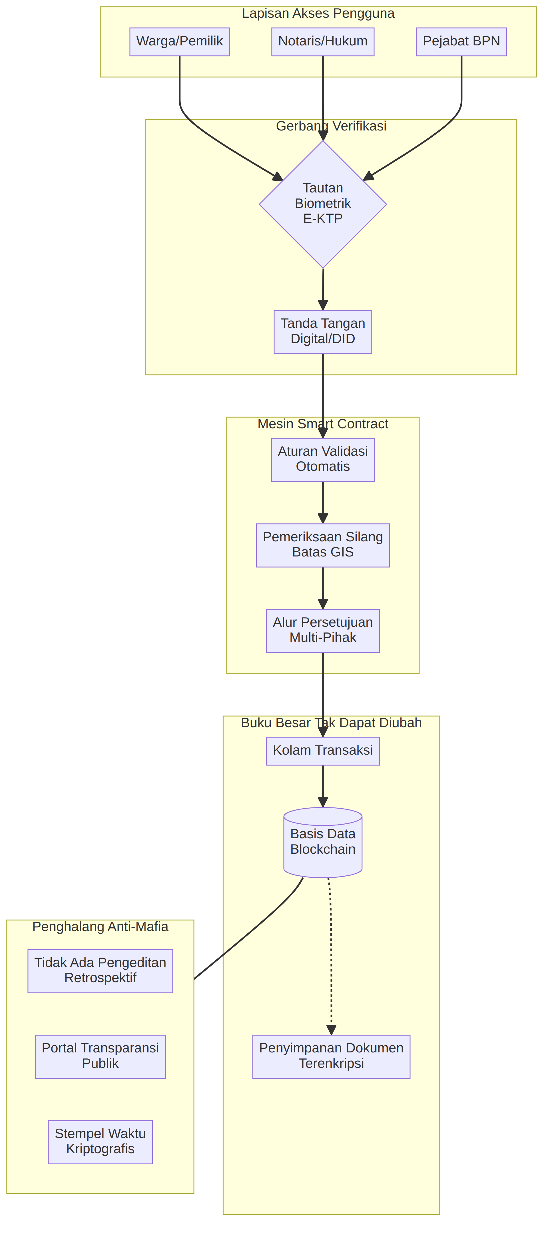 Fondasi ketiga adalah kepatuhan terhadap peraturan, memastikan bahwa sistem selaras dengan kerangka hukum Indonesia yang terus berkembang. Pada tahun 2026, peraturan seperti PP No. 28/2025 mulai secara resmi mengakui aktivitas blockchain. Oleh karena itu, teknologi tersebut harus mendukung kontrak pintar yang beroperasi dalam batas-batas hukum perdata Indonesia. Sistem ini juga harus mencakup mekanisme yang memungkinkan intervensi pengadilan, sehingga pihak berwenang dapat membatalkan transaksi curang sambil tetap menjaga integritas sistem secara keseluruhan. Integrasi dengan identitas digital sama pentingnya, membutuhkan kompatibilitas dengan sistem identitas nasional seperti E-KTP sehingga setiap tanda tangan digital memiliki validitas hukum di pengadilan.