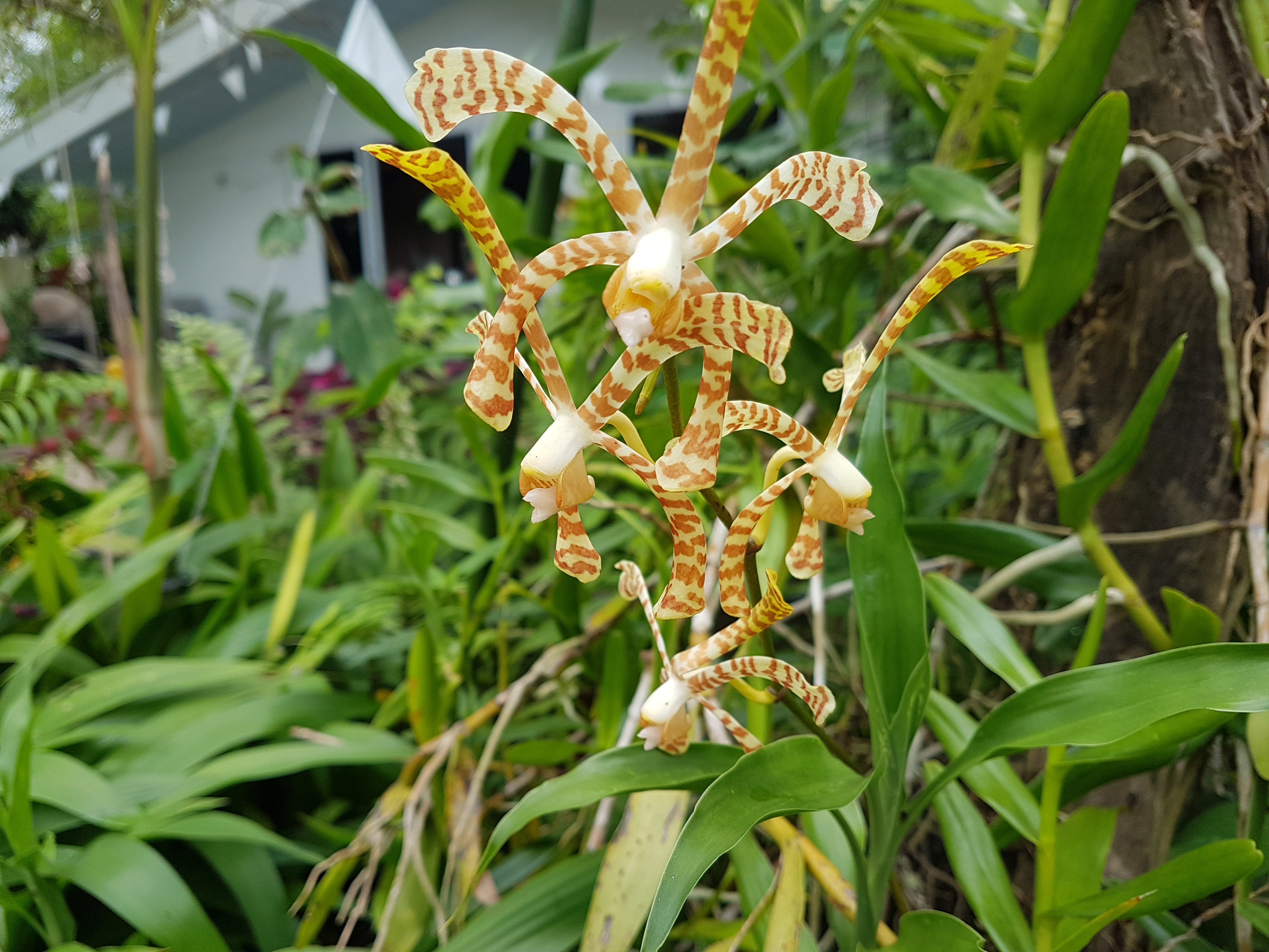 อีกต้นประเภทกล้วยไม้ดอกแมลงปอ ซึ่งกล้วยไม้ชนิดนี้ปลูกง่ายมากค่ะ เพราะมันจะ เป็นก้าน และมีใบ ที่ค่อนข้างแข็งและราบ ก็จะขึ้นที่กิ่งก้านเยอะพอสมควรค่ะตัดกิ่งแค่นำมาปักชำก็รอดแล้วค่ะอ้อมนำมาปลูกไว้ในบริเวณข้างบ้านใต้ต้นไม้ อาศัยร่มเงาของต้นไม้อื่นทำ ให้ต้นแมงปอเจริญเติบโต เร็วค่ะตอนนี้ต้นแมลงปออายุได้เกือบปีแล้ว ซึ่งแตกแขนง และออกดอกมาให้ได้เชยชมแล้วค่ะออกดอกสีเหลืองมีลาย สีเหลืองเข้ม สวยงามเชียวค่ะ ออมถ่ายกับโทรศัพท์