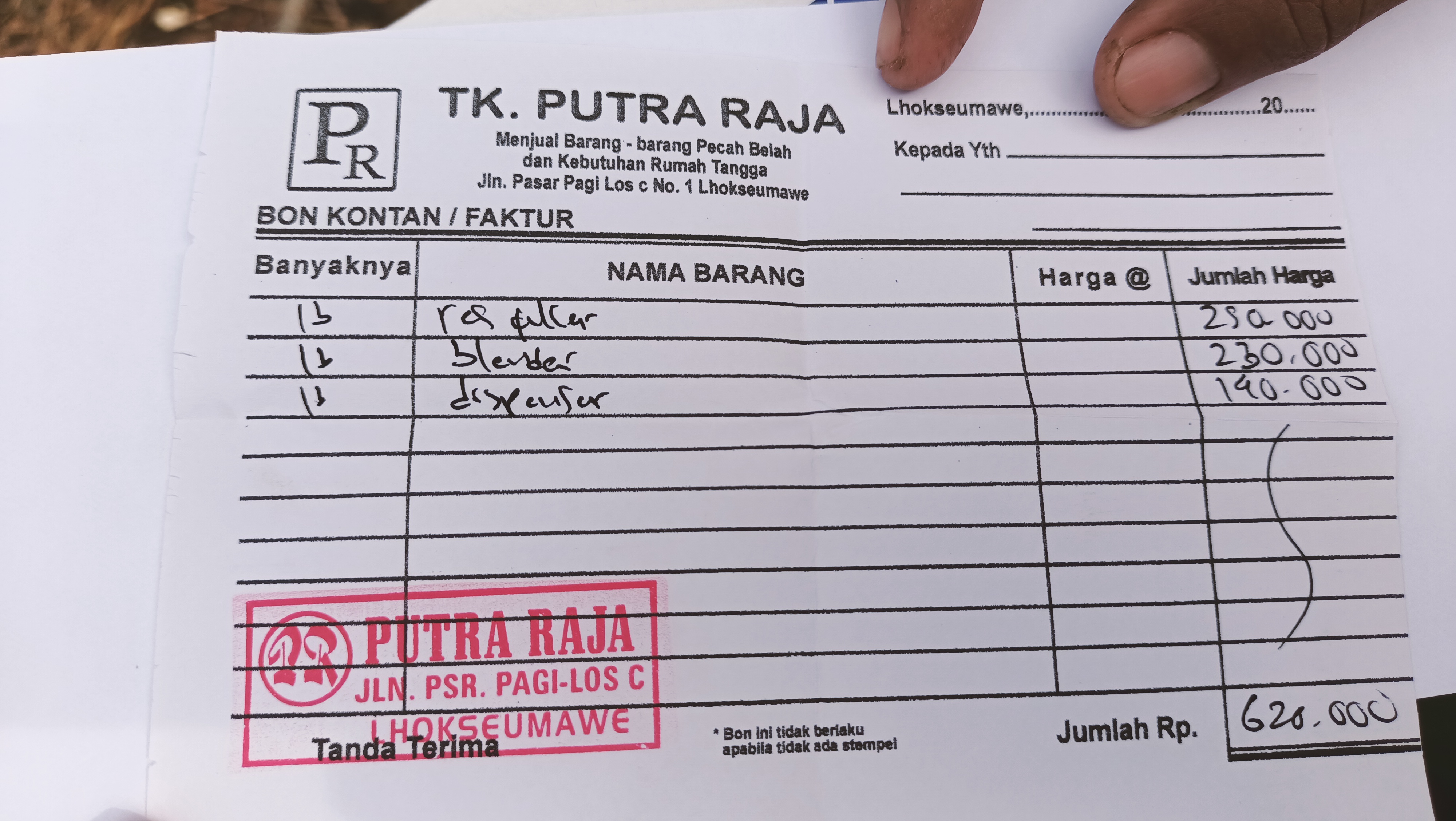 Berdasarkan hasil surver kebakaran rumah di Desa Maddi Nibong, Aceh Utara, pada 09 September 2024 oleh pak @radjasalman bersama relawan Steem Amal seperti @walictd, @yusrawati @asnita0110, @julifitrina dan @hasinbadir. Maka pada hari Kamis 12 September 2024 langsung dilakukan persiapan bantuan dan penyerahannya. Pada jam 12:00 siang, pak @radjsalman berserta relawan Steem Amal seperti @walictd, @sriiza, @megaaulia, dan @hasinbadir berkumpul untuk siap berangkat ke Desa Maddi Nibong, Aceh Utara menuju rumah kebakaran yang di huni oleh Jailani (34) dan keluarganya. Untuk persiapan bantuan sudah terlebih dahulu di belanjakan tadi pagi seperti penanak nasi, dispenser, dan blender. Berikut bukti pembeliannya :