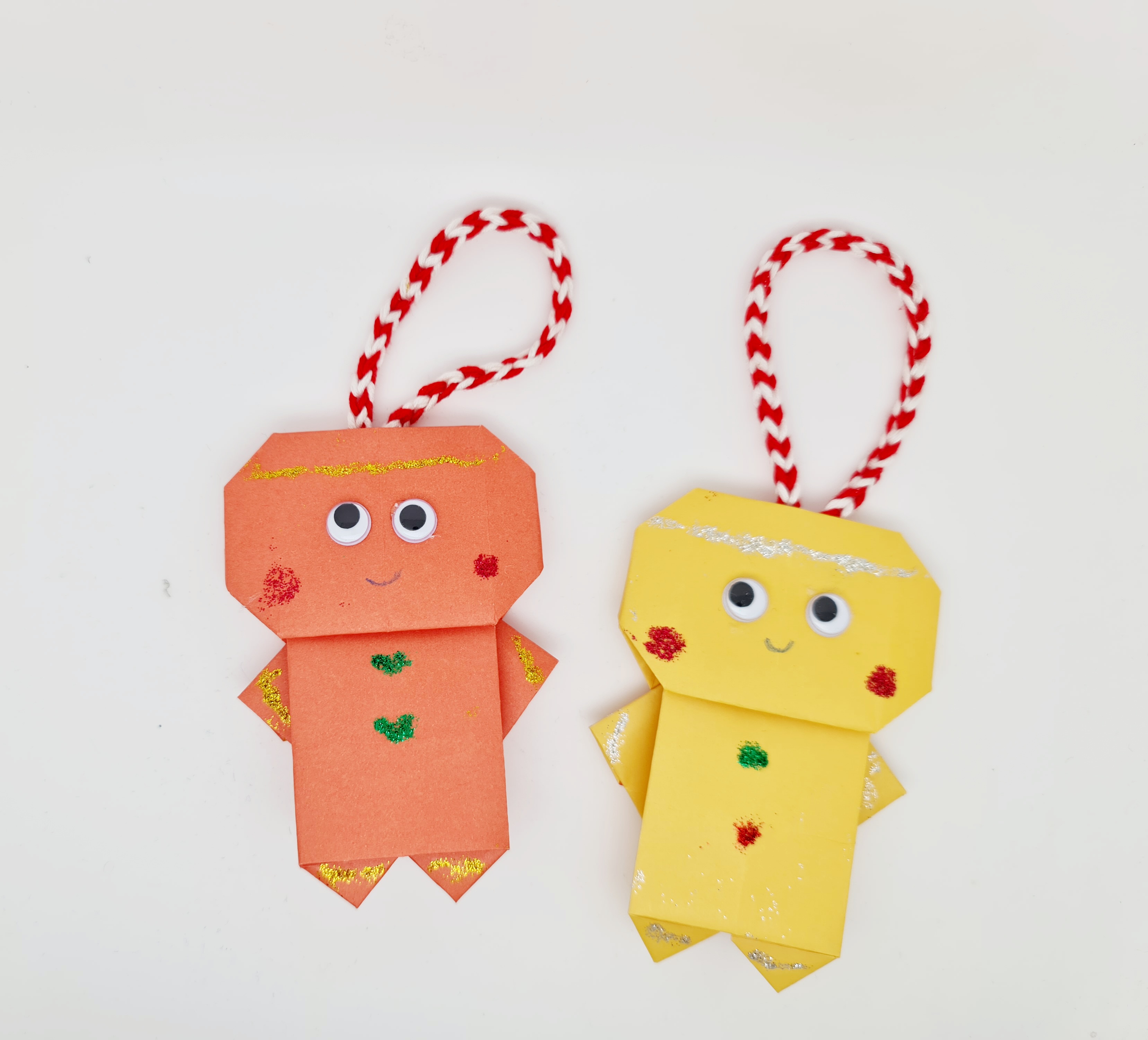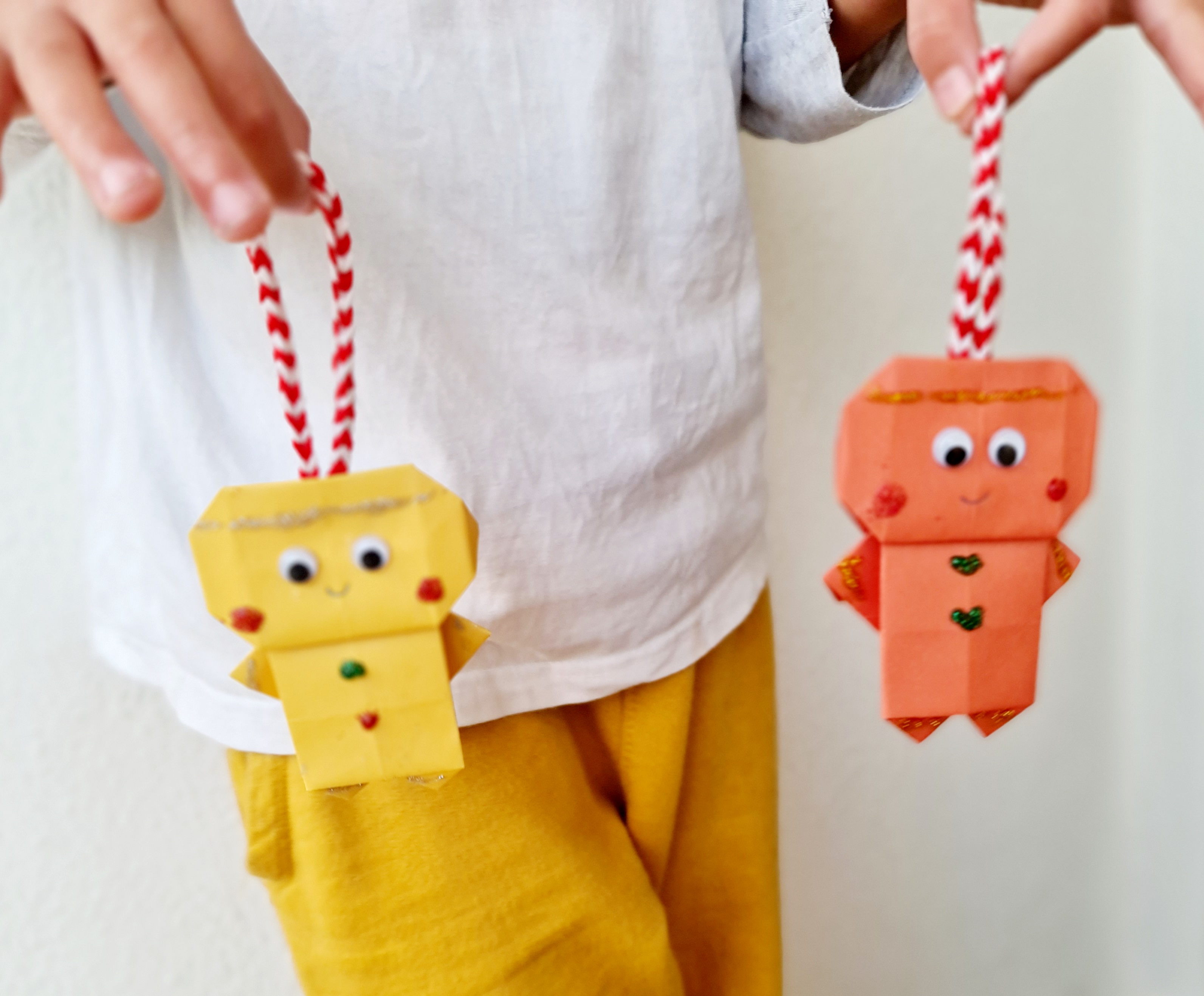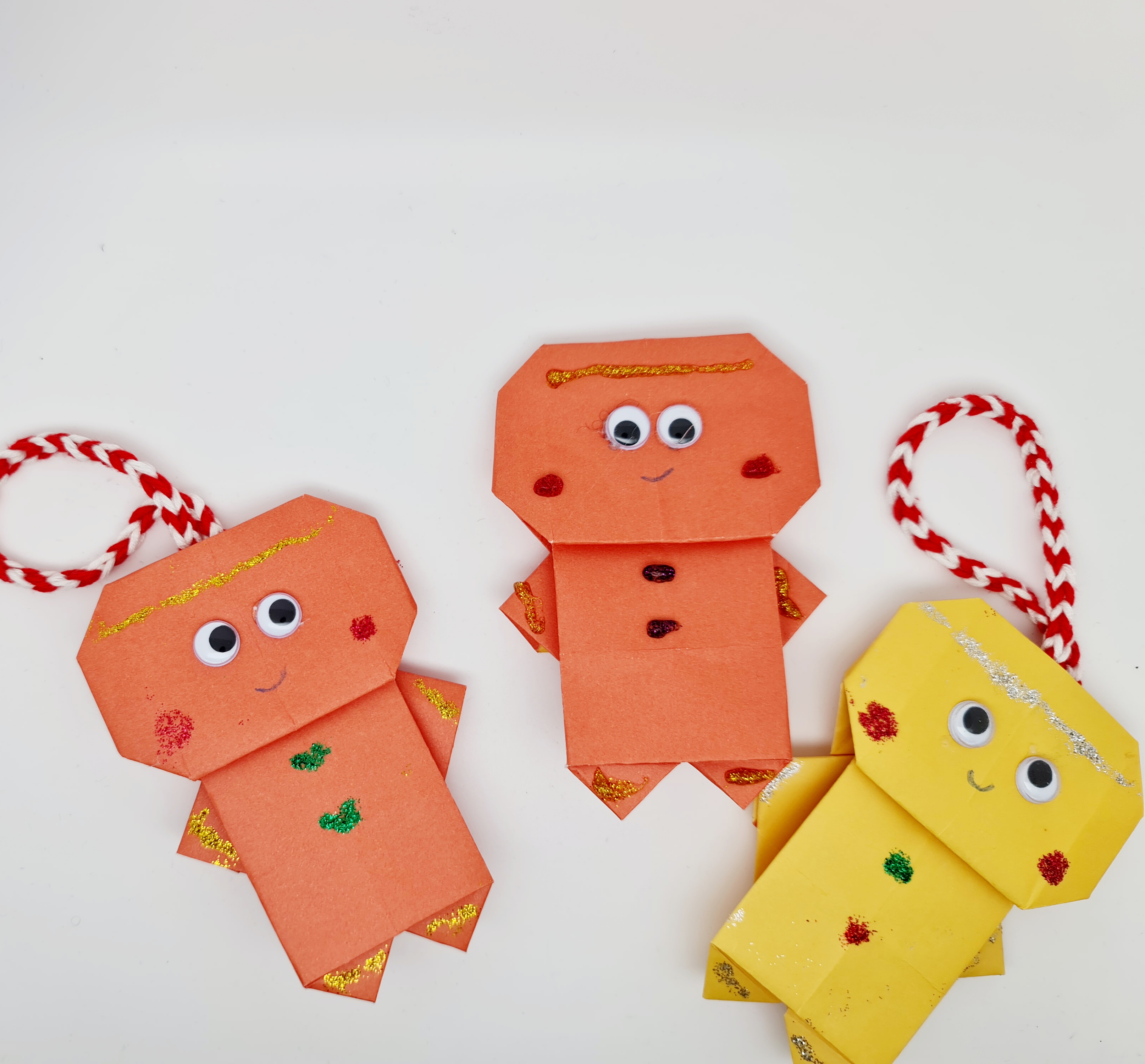 Please welcome my latest creations. These are gingerbread men. They are made with origami paper and using origami techniques. I folded paper several times to make this little buddies for my Christmas tree.