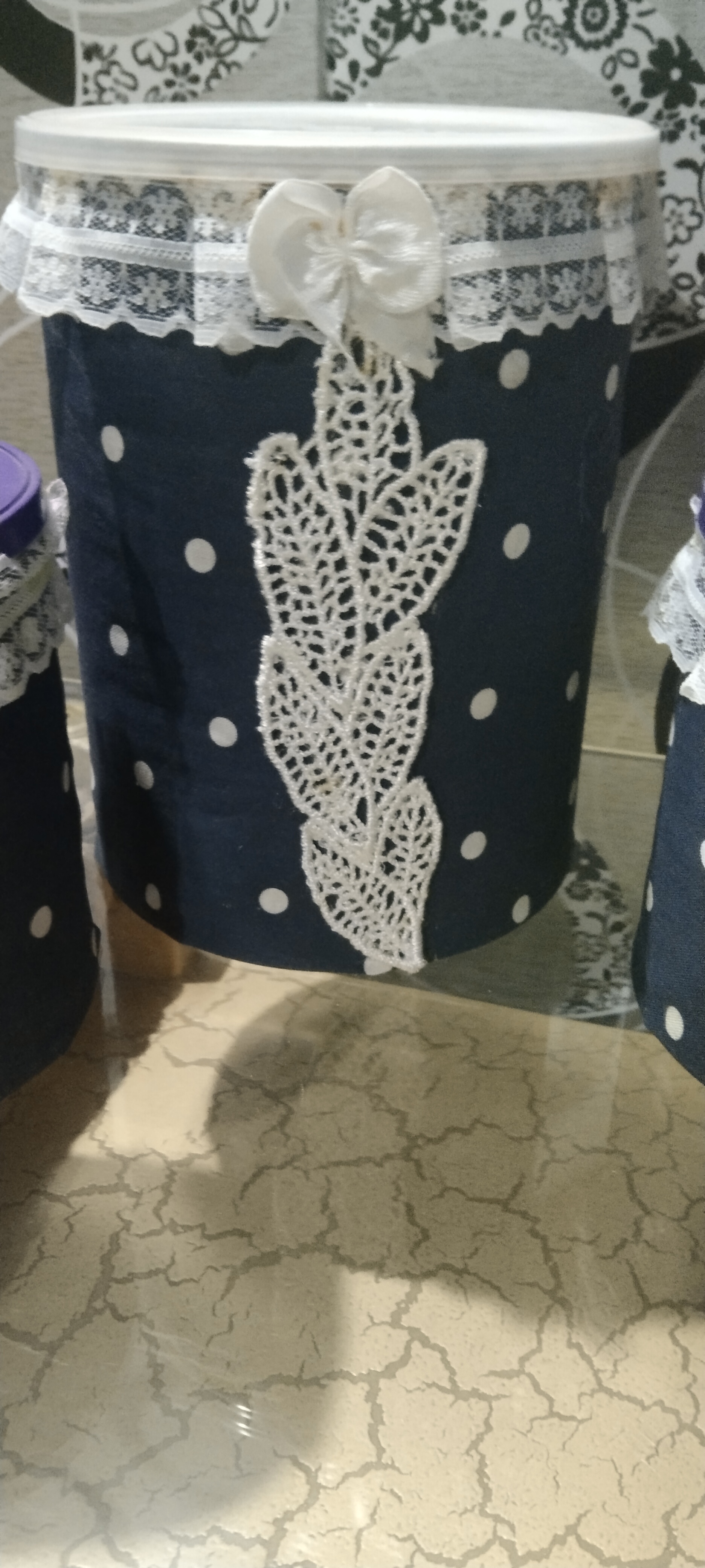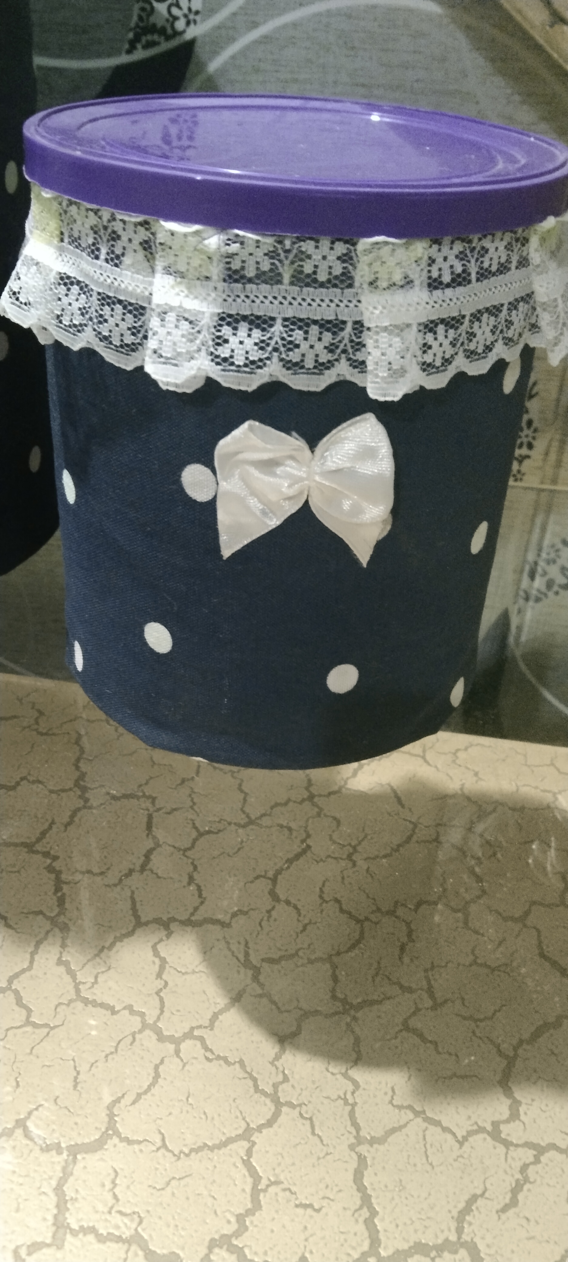 The small box is also covered with blue dots cloth. Its designed by flower net and one small tie.