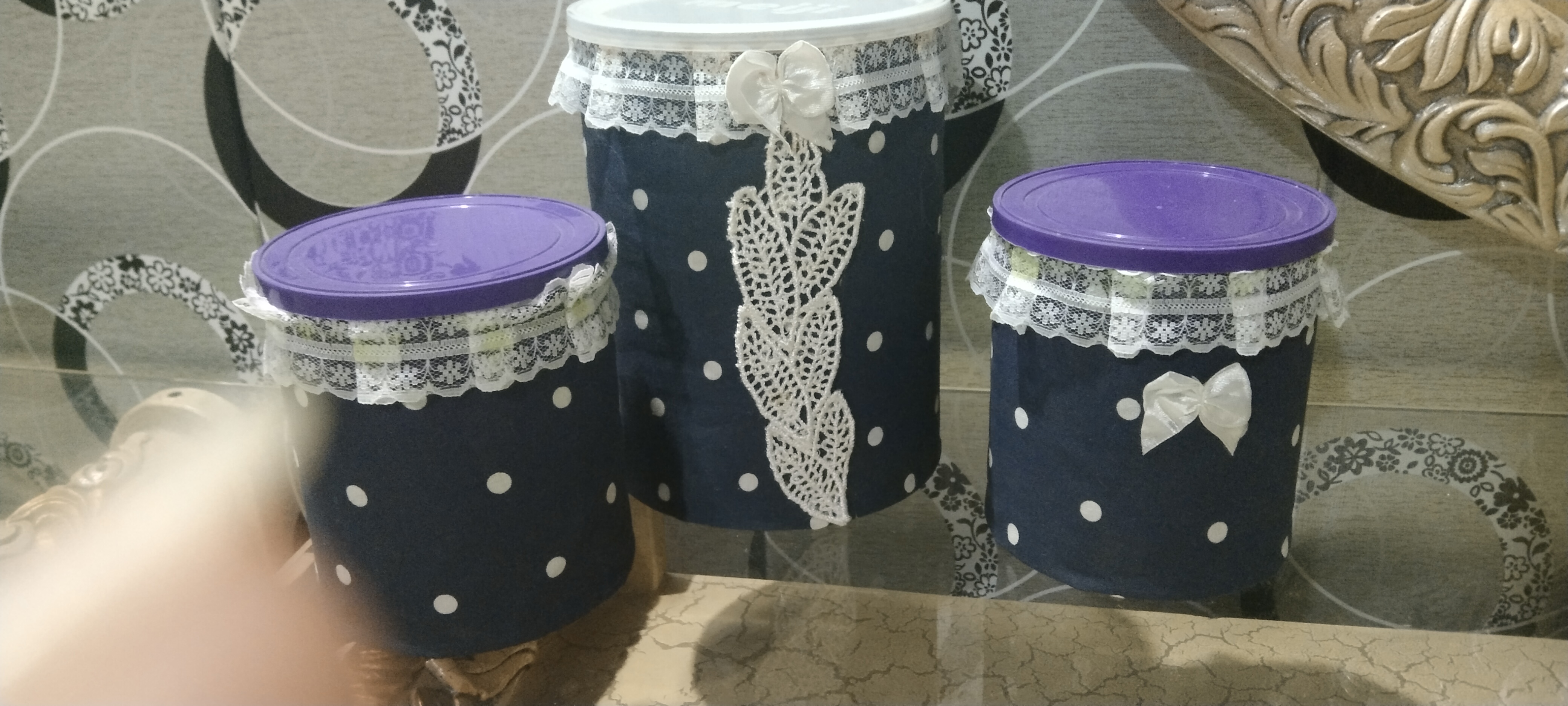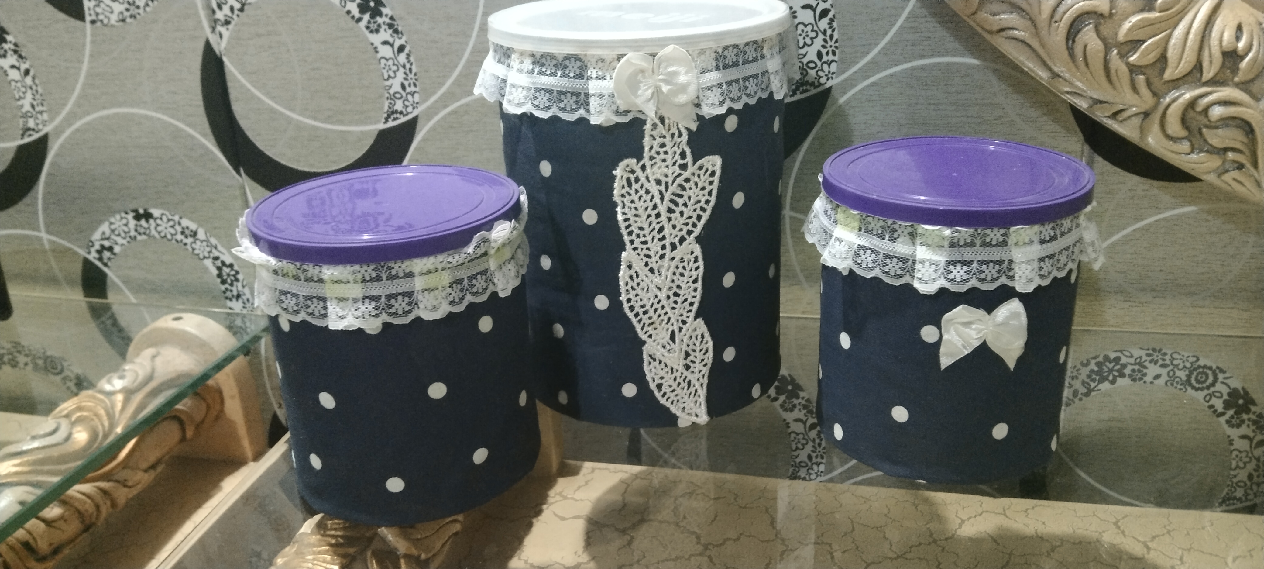 These are tean boxes which covered with blue printed cloth.