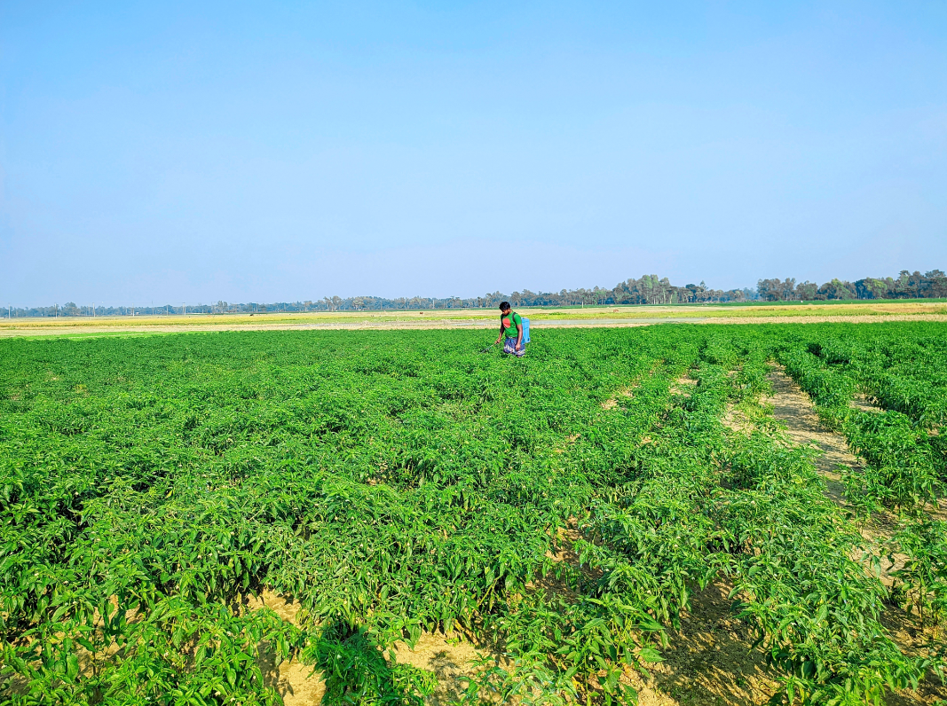 This morning, I was excited to go to our chilli field. The entire field is now green and lush. The trees are very fresh, and many chillies are also visible. But at this time, the crop has to be taken care of very carefully, otherwise everything gets damaged by insects.