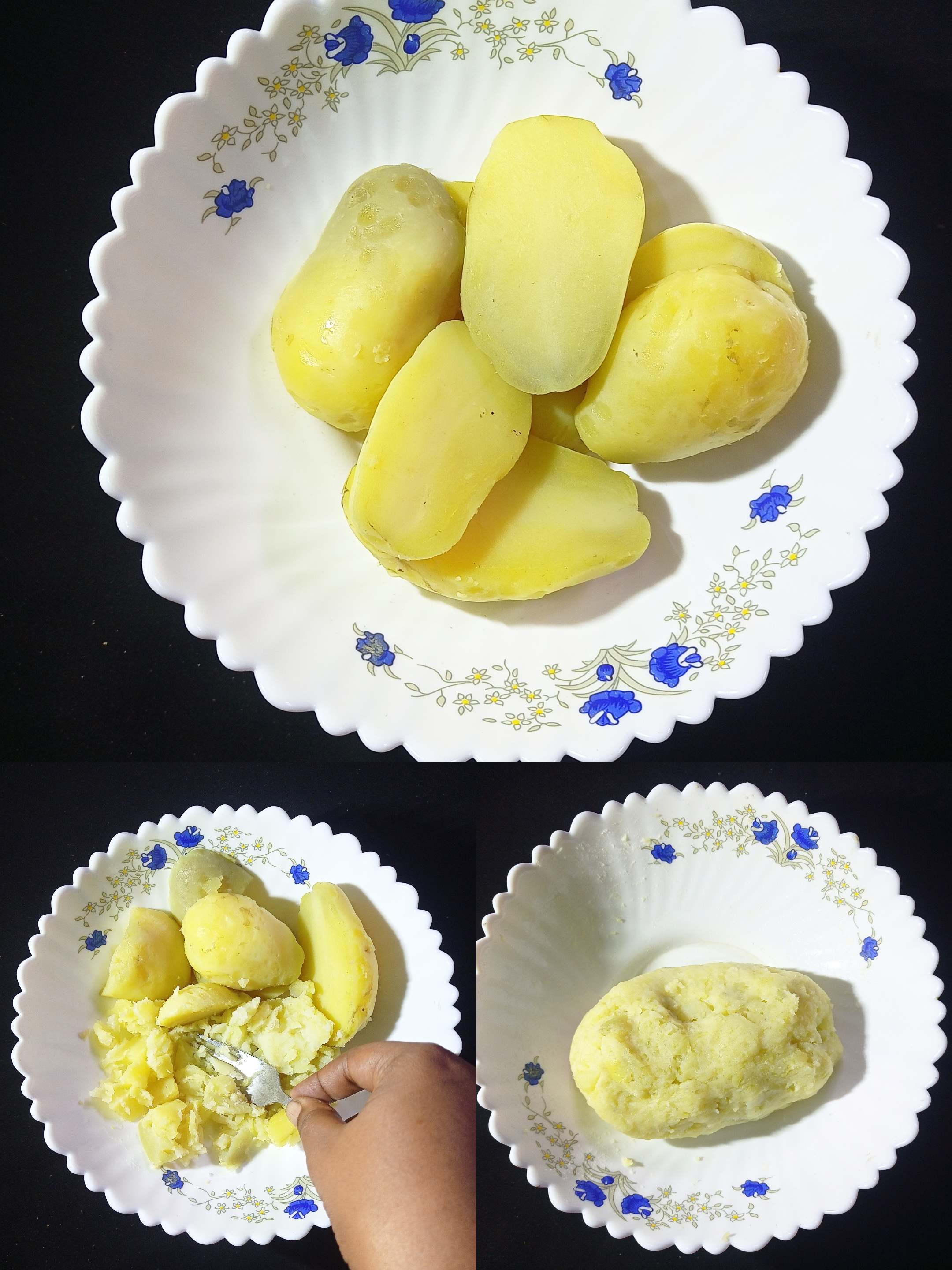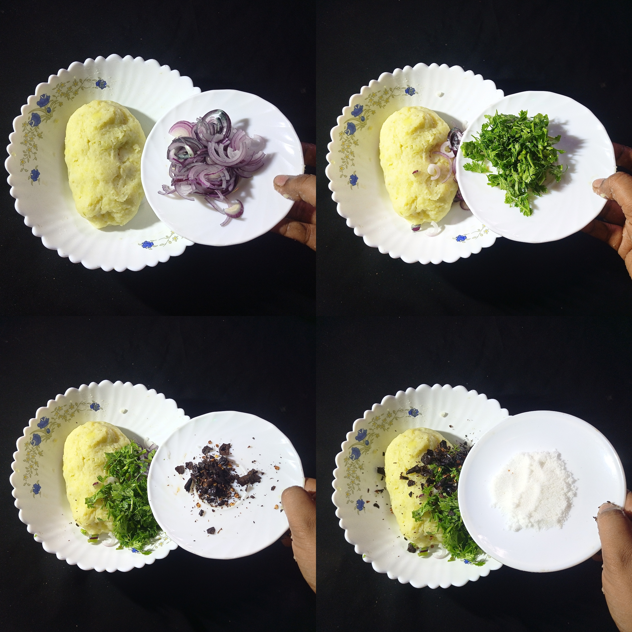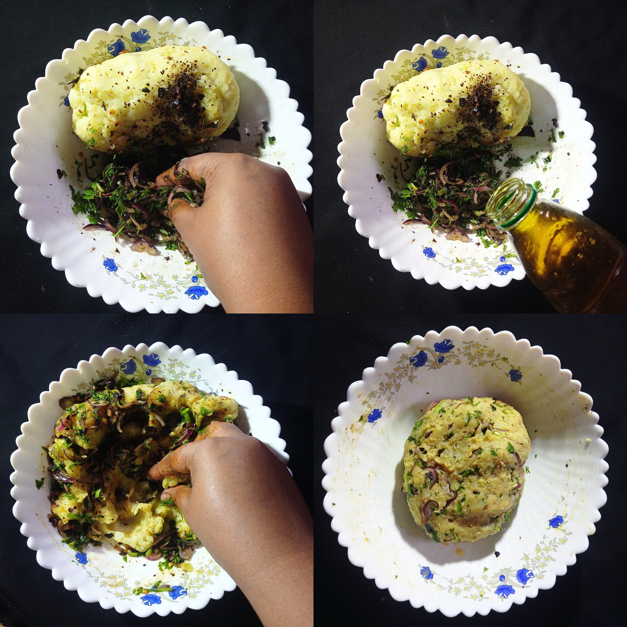 Then, first, I mixed everything together with salt and then mixed it well with the potatoes with the appropriate amount of mustard oil to make potato puree.