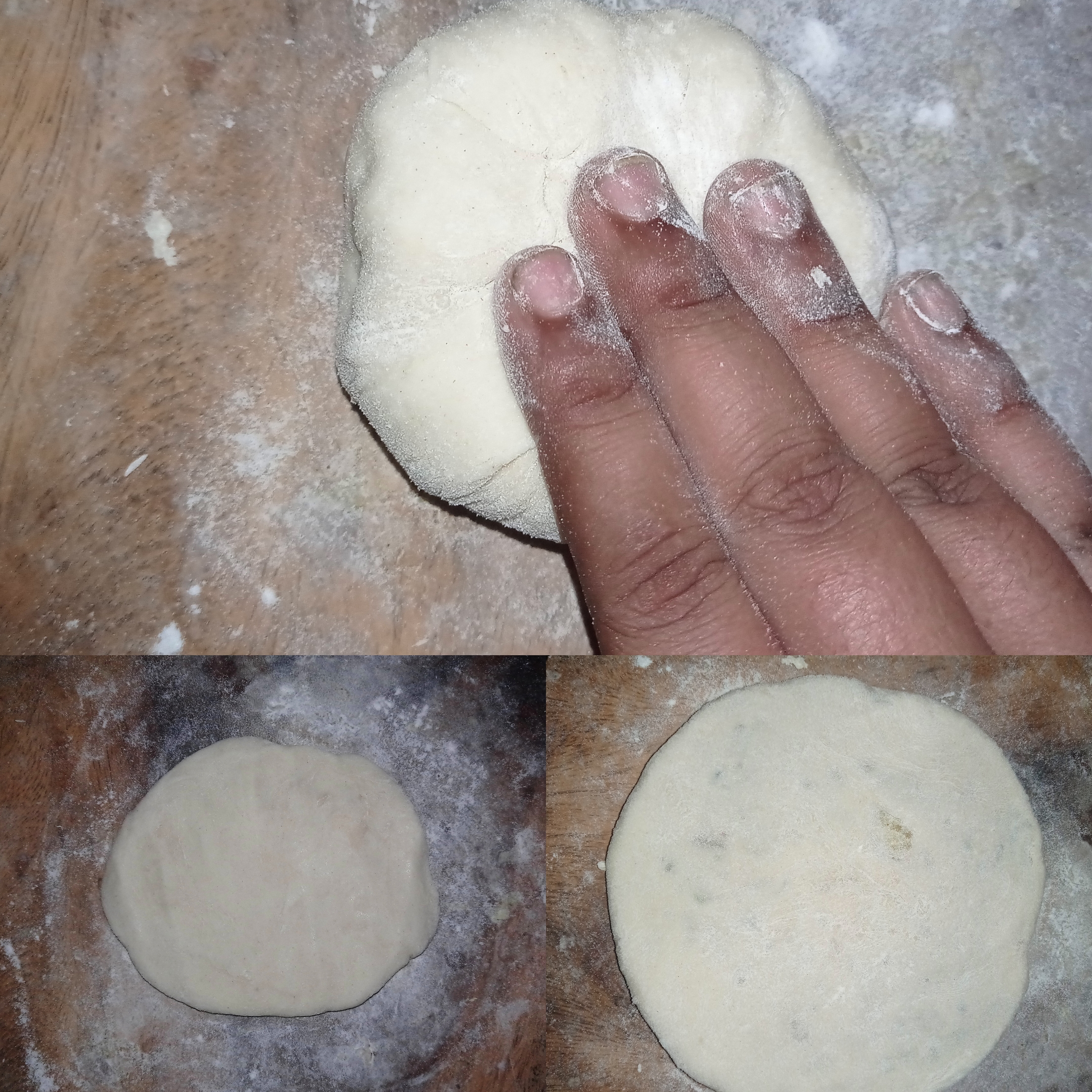Then I took a small portion of the kneaded dough and rolled it out first. Then I put the potato filling in the middle, rolled it out again and rolled it out well.