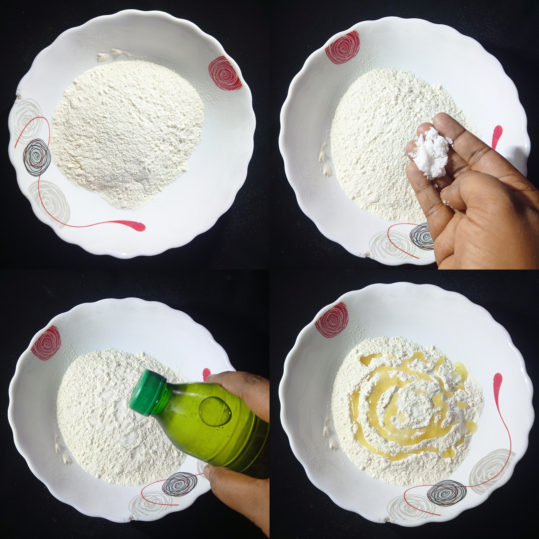 Then I took a cup of flour. Then I added salt to taste and two spoons of soybean oil to the flour.