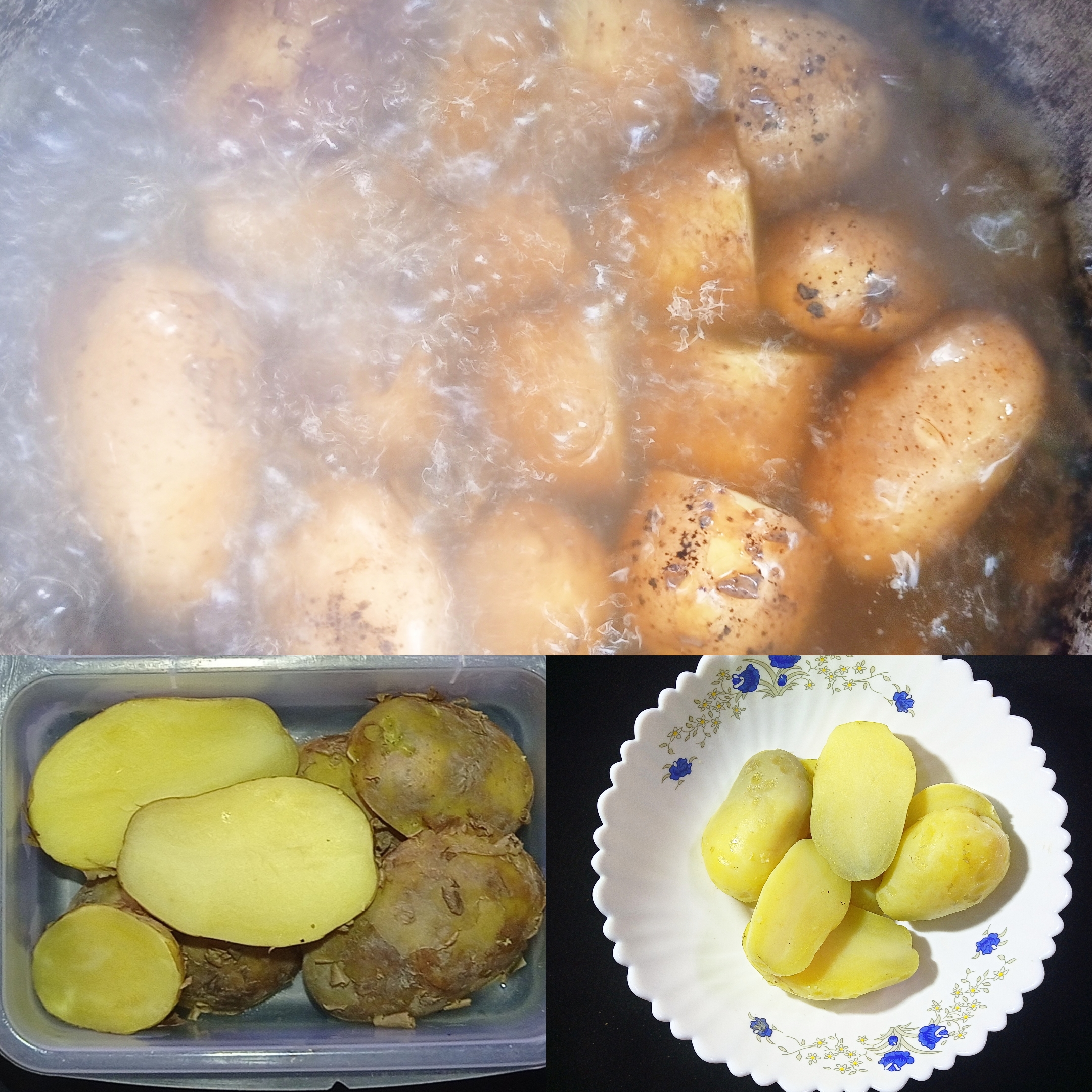 First, I cut a few potatoes in half and put them in a pot to boil. Then, I boiled them well and cooked them.