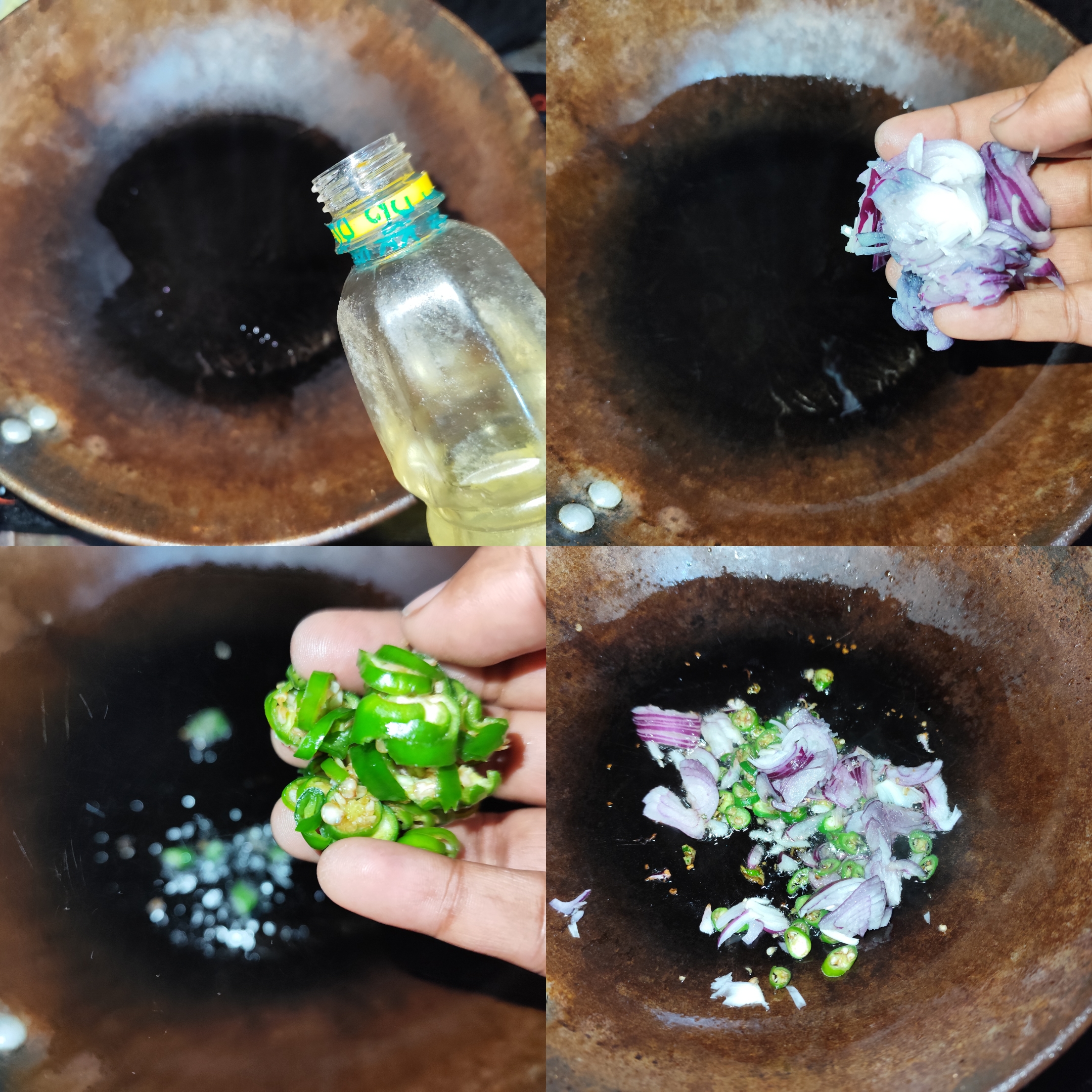 Then I added oil to the pan, then chopped onion and green chilies, stirred well and fried them.