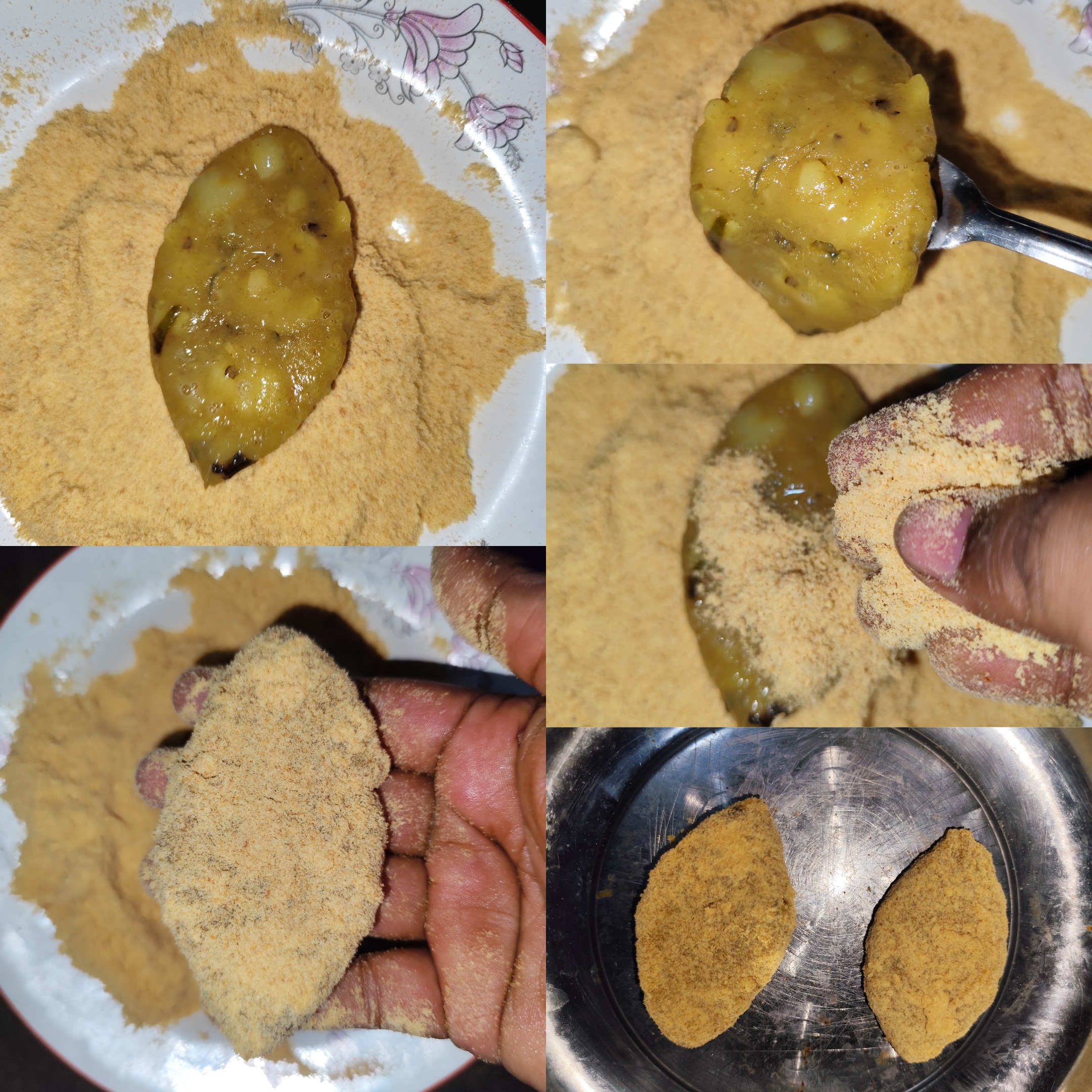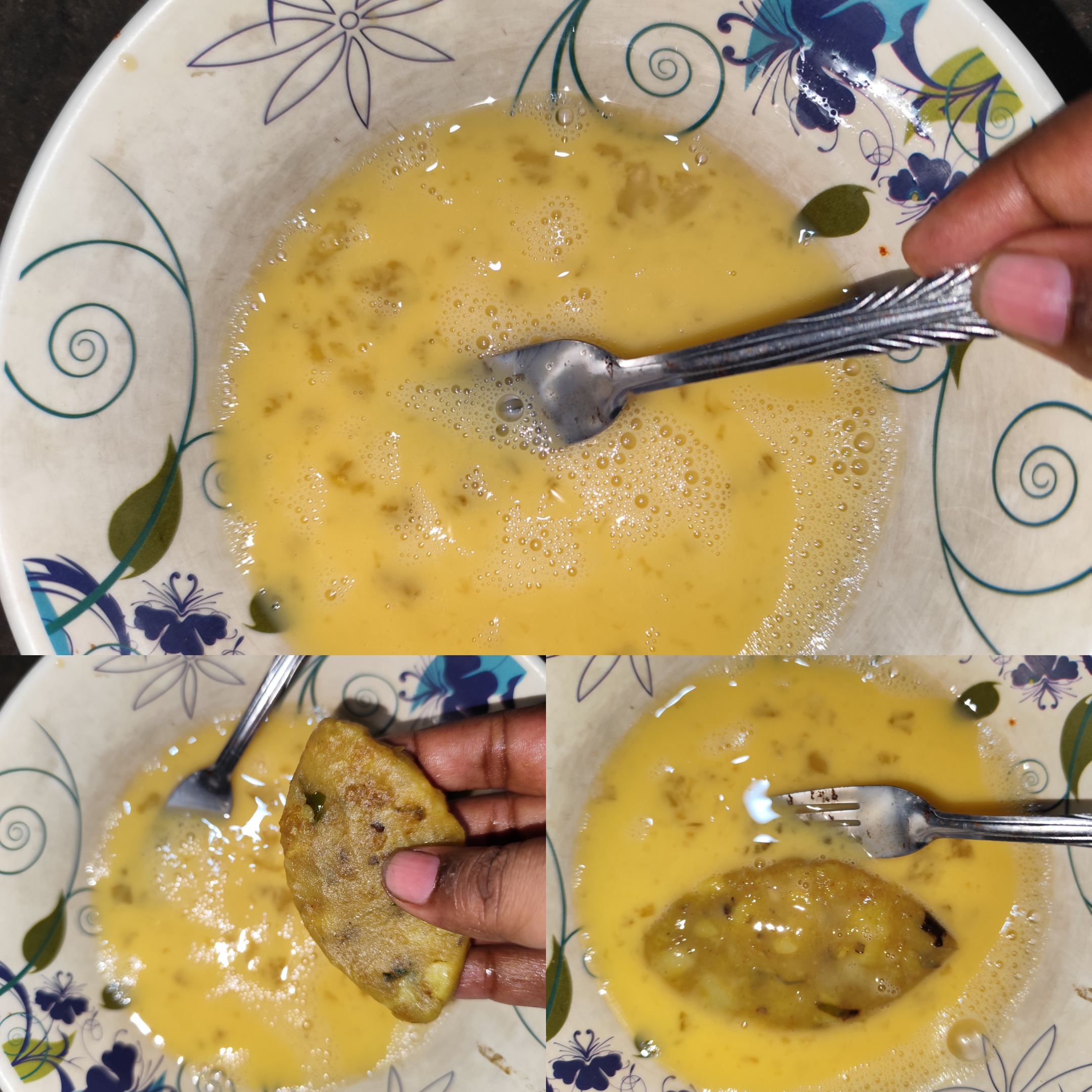 I took a cloth and cracked an egg into a bowl. Then I dipped the potato cutlets in the egg and placed them in the biscuit crumbs.
