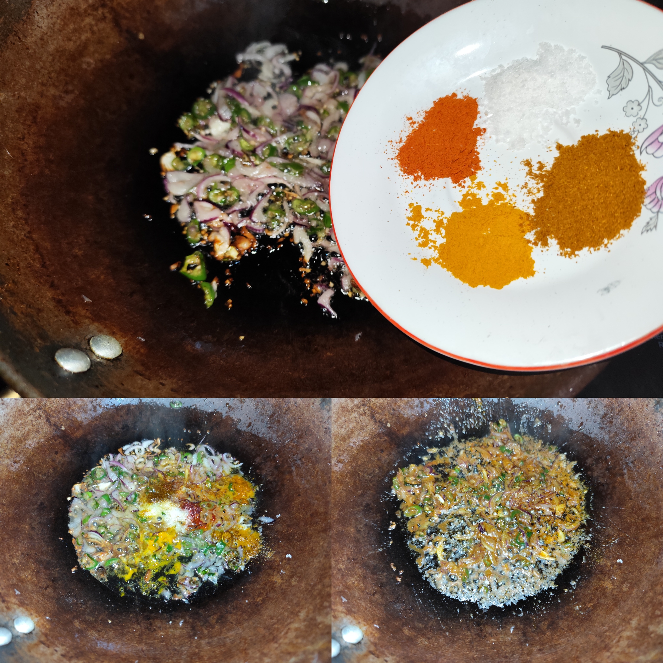 Then I added everything together, turmeric, chili powder, salt, and onion, stirred well again, and fried it.