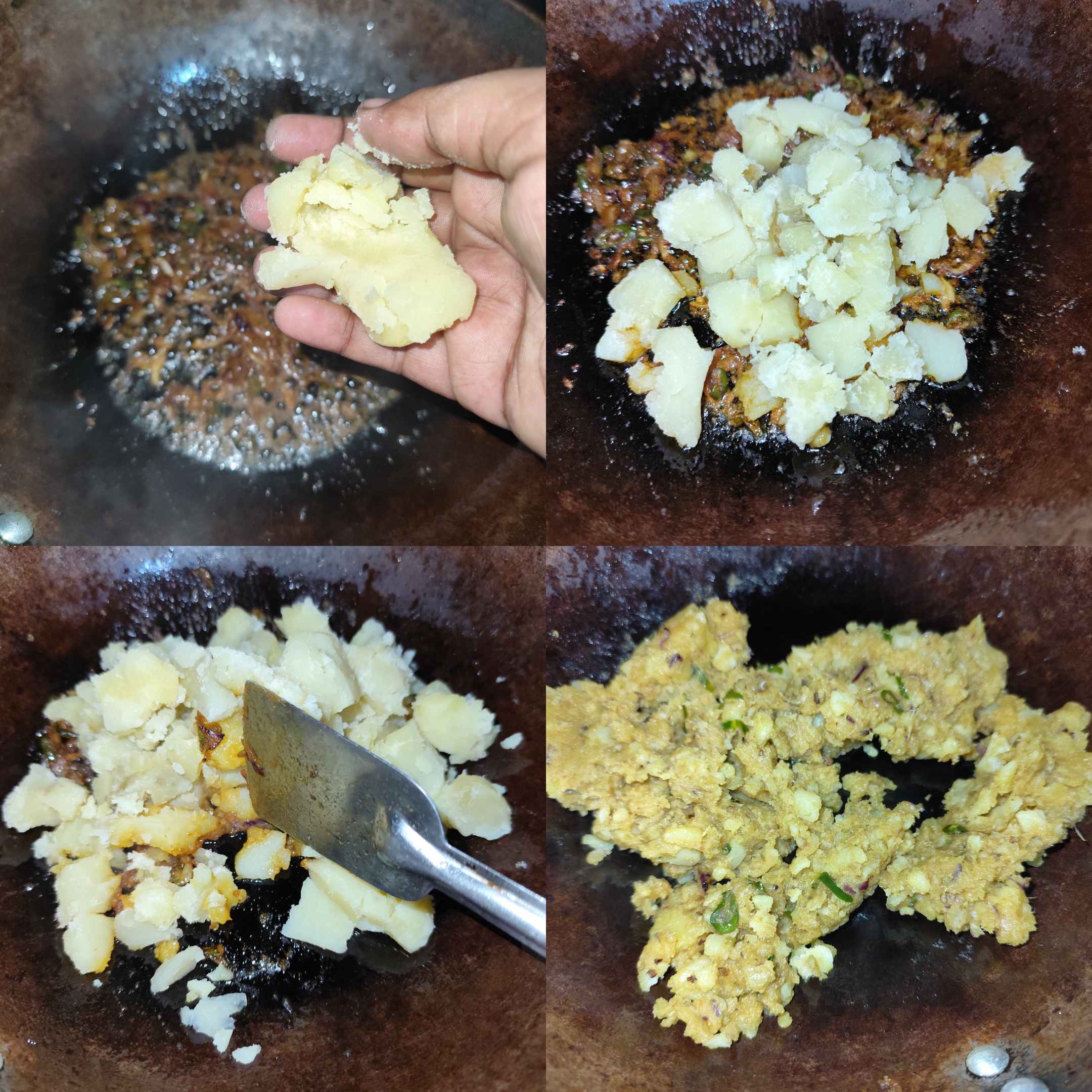 Then I broke the boiled potatoes and added them to the spices, stirring well again to mix everything together.