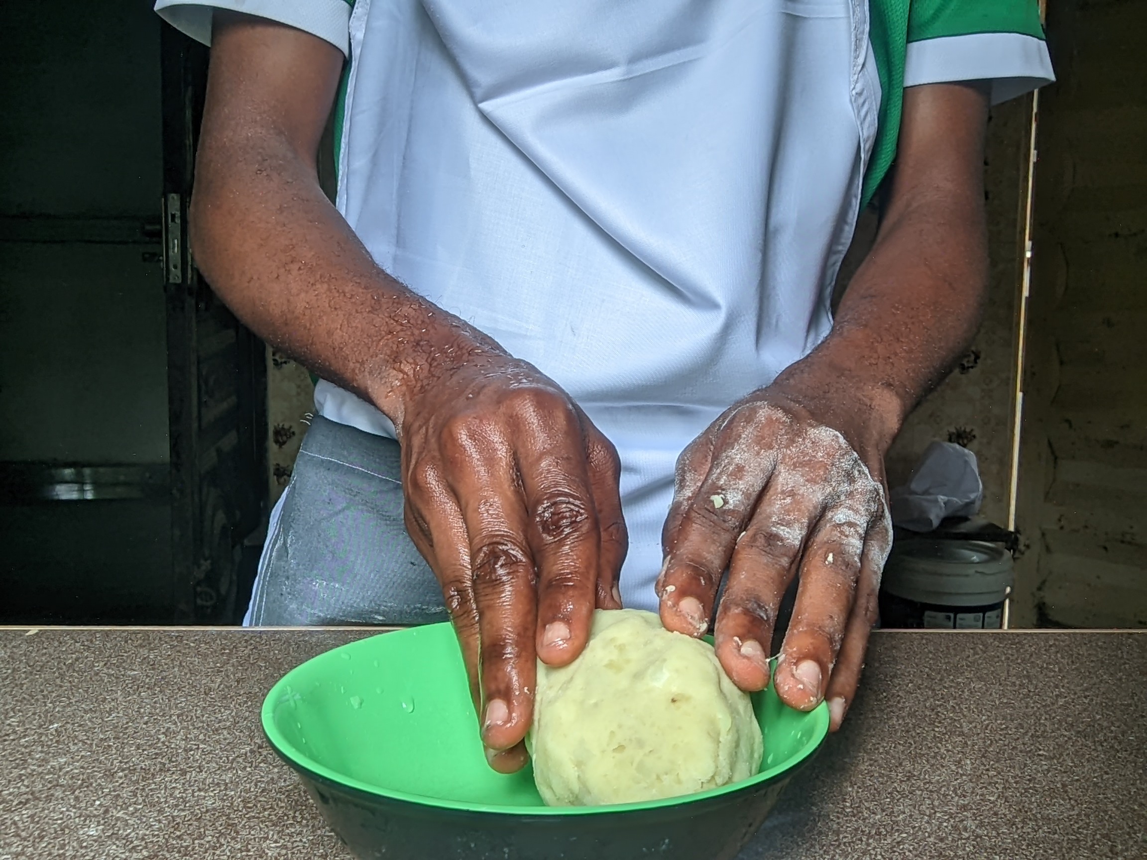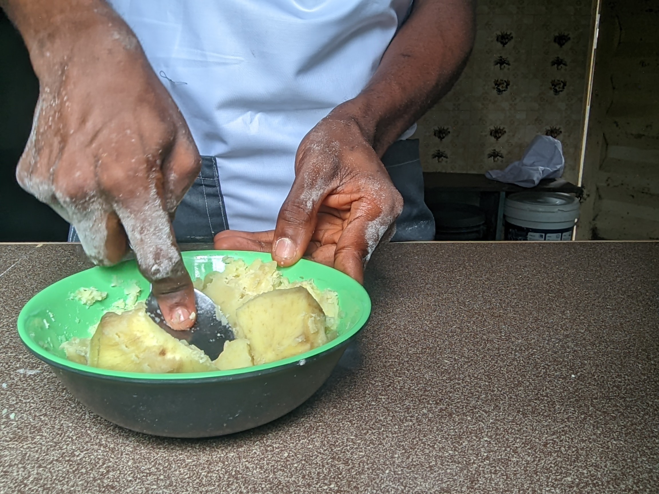 - I then spread flour on a tray and placed the dough there to focus on the potatoes as it was done boiling and became soft for turning into mash. It's always ideal to mash the potatoes when hot. So after bringing it down from my heat, I contained it on a bowl and mashed it till it becomes like paste.
