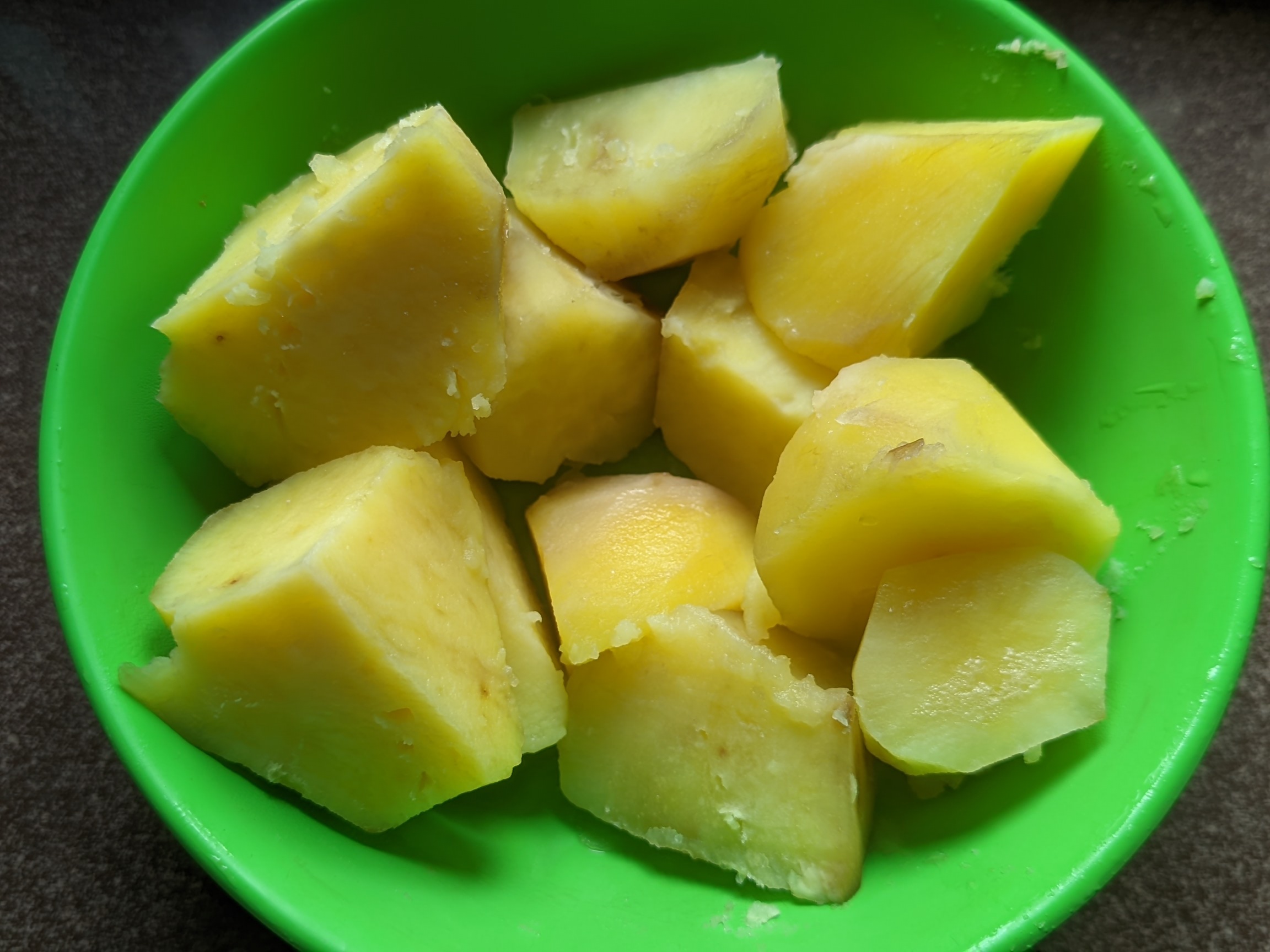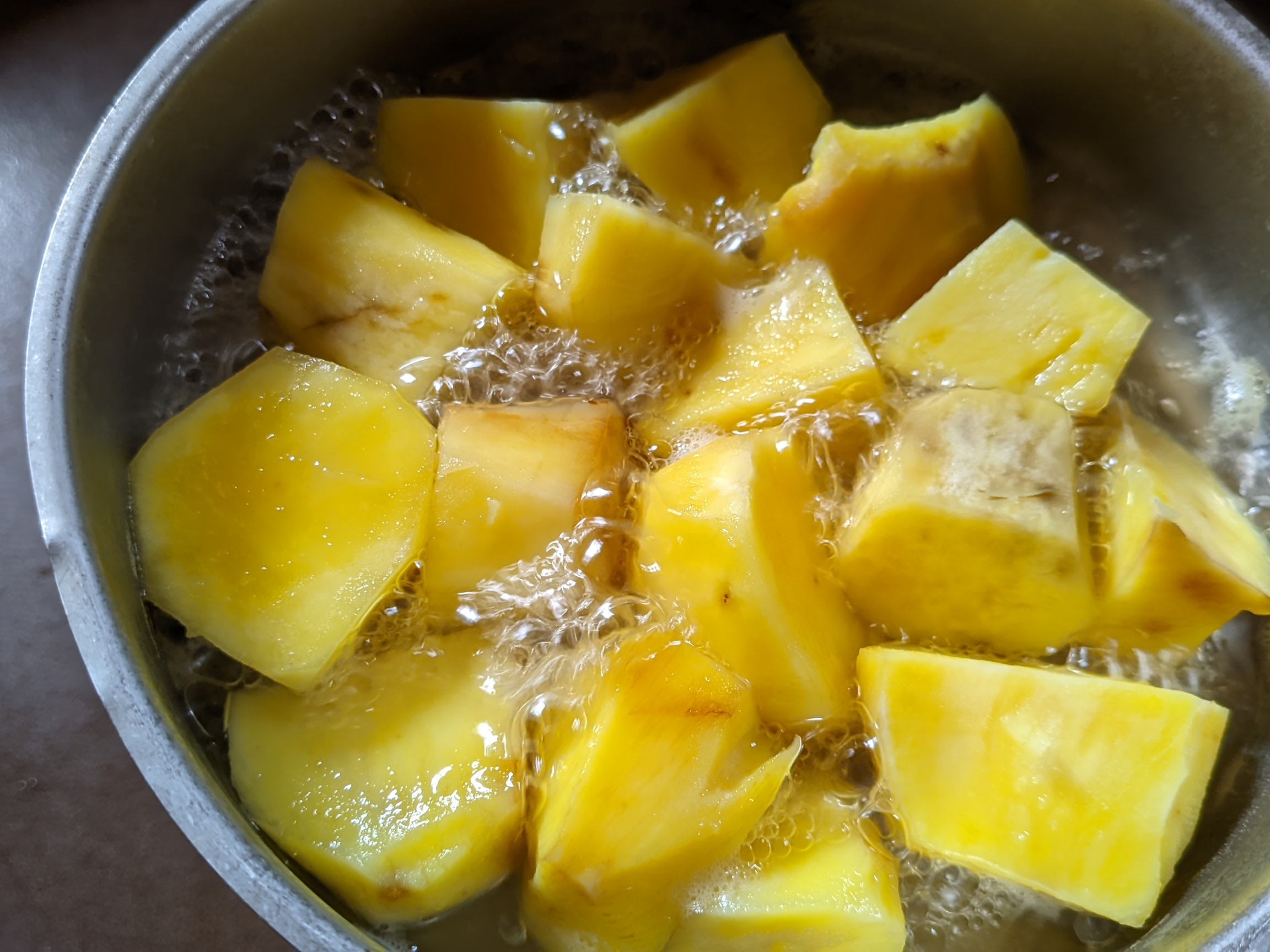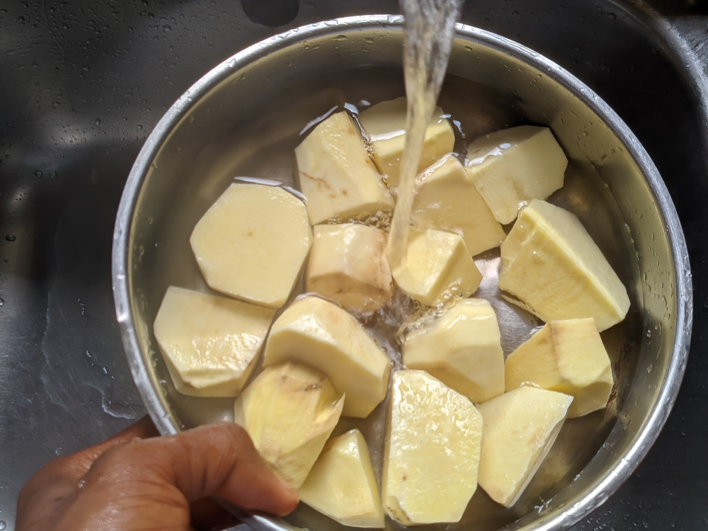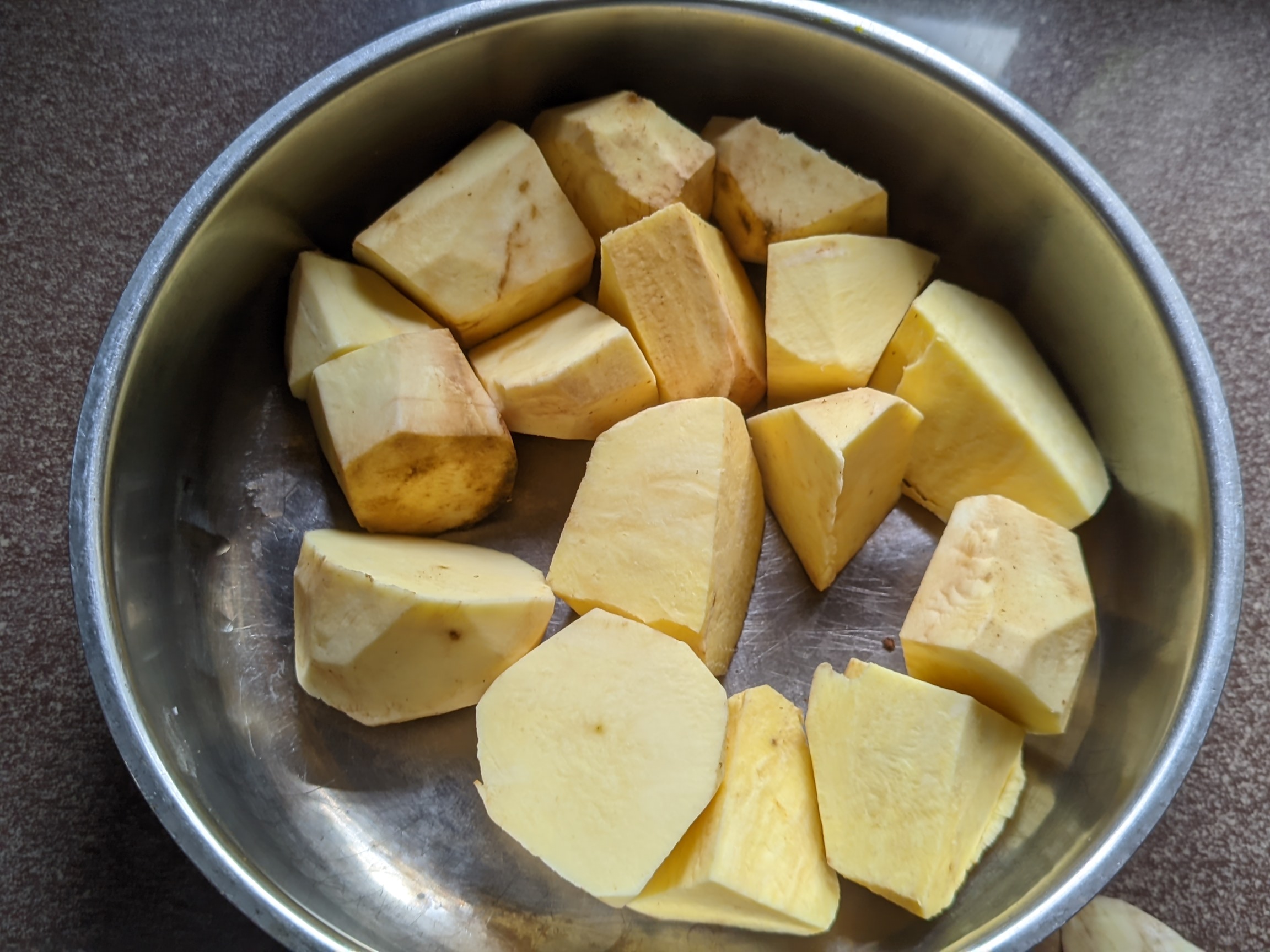- I arranged my ingredients first before determining which one would be taken into consideration first. The arrangement of ingredients helped me know the one that's not available, so I won't have to run in search for it when I've already gone far with the preparation. My potatoes were the first thing I tackled. I peeled and cut them into little pieces because putting it whole may delay it from becoming easily soft. After that, I washed the potatoes in running water and contained it in a plate before putting it into my steam pot with pinches of salt to taste.