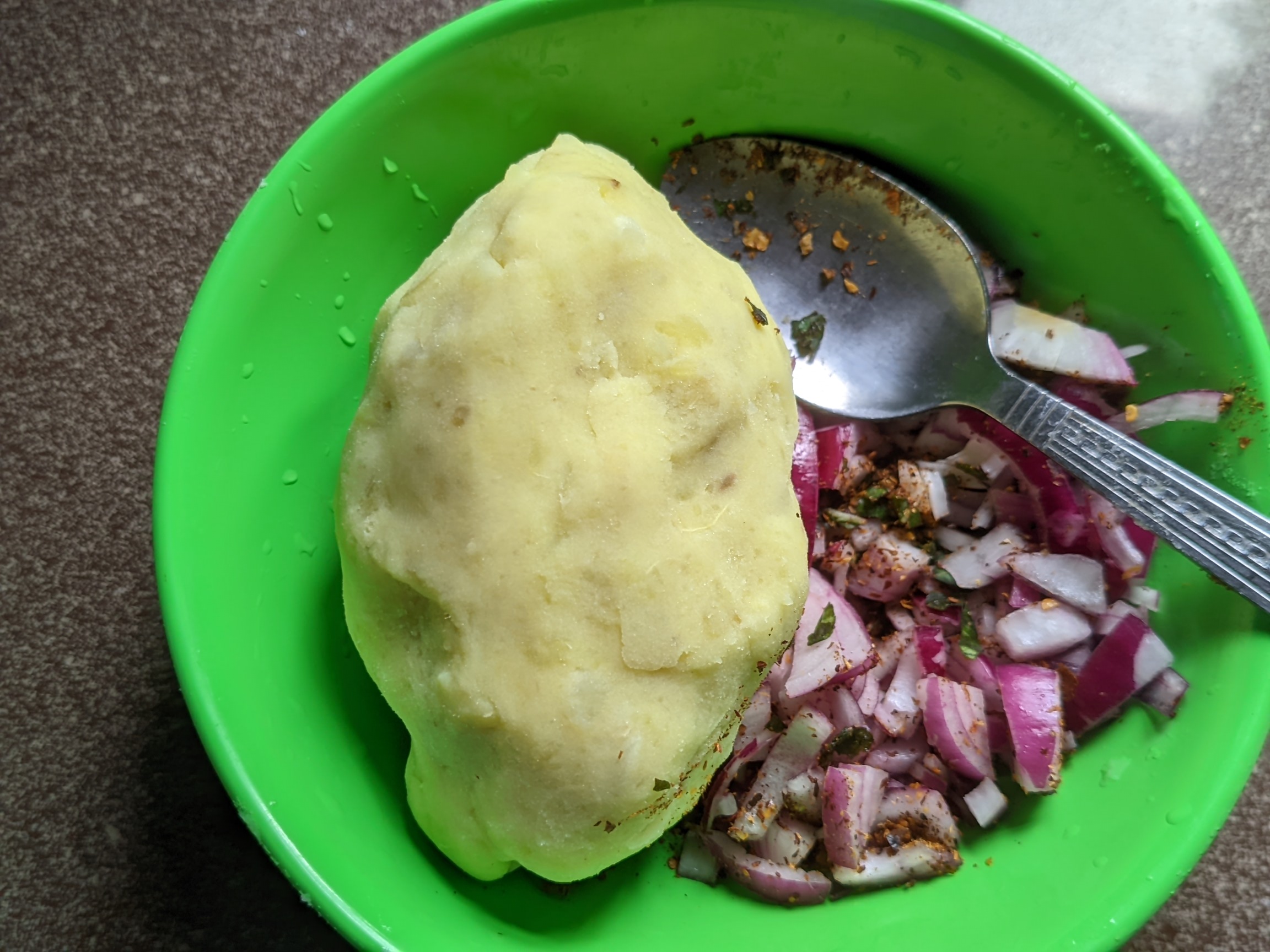 - I added 2 tablespoons of mustard oil into the mashed potatoes, sliced my coriander leaves into tiny pieces and did same with my onions. Cutting it into tiny pieces prevents difficulties when we want to roll the dough together with the mixture.