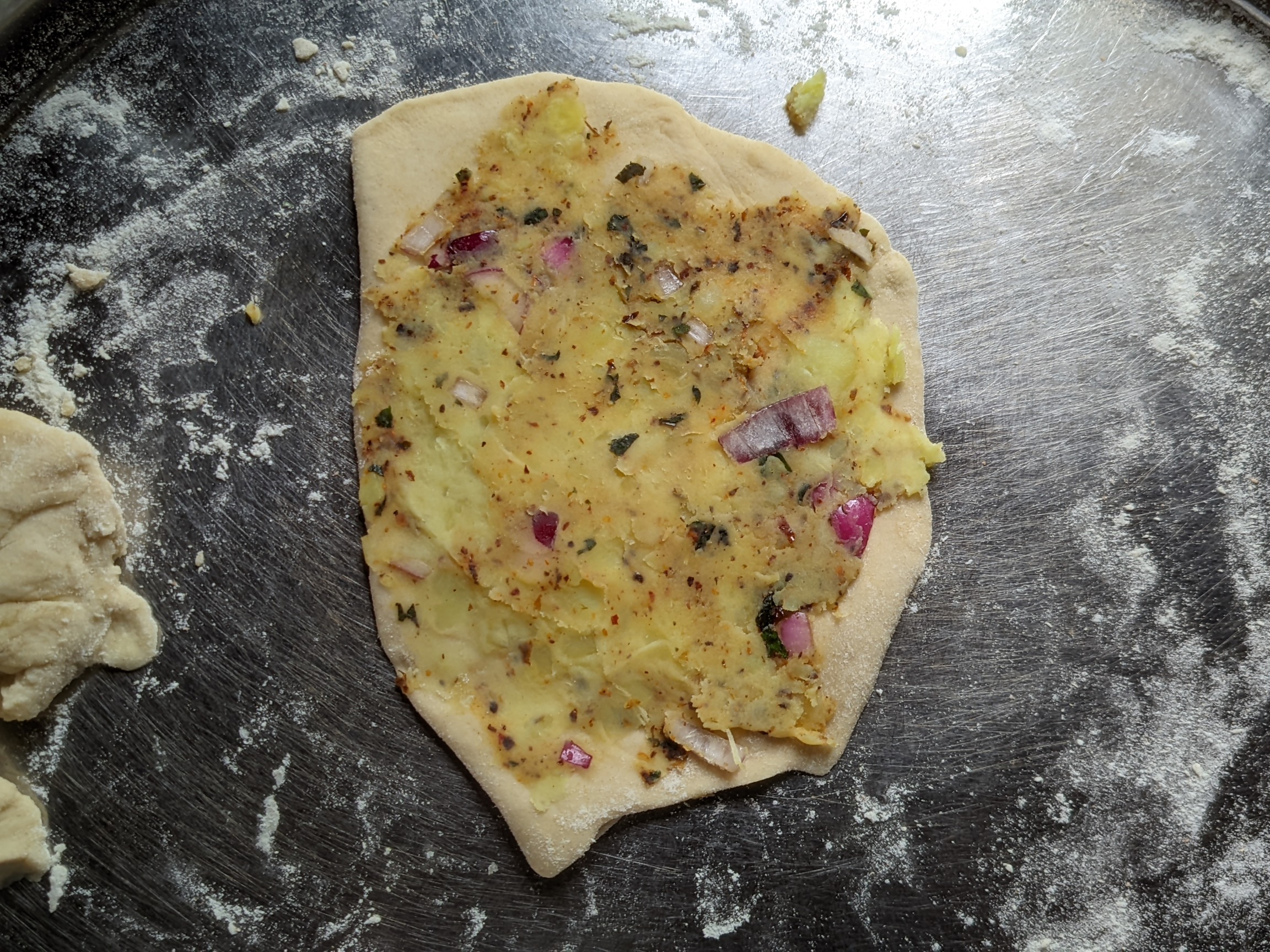 - After that, I cut the dough in pieces and spread it so it becomes thin. I then spread the fillings on the dough and folded it to roll again. This time I was careful to avoid spilling. I then rolled it with the aid of adding flour and cut them into shapes with a knife. That was how I was able to achieve this new recipe I'm just trying for the first time, potato paratha.