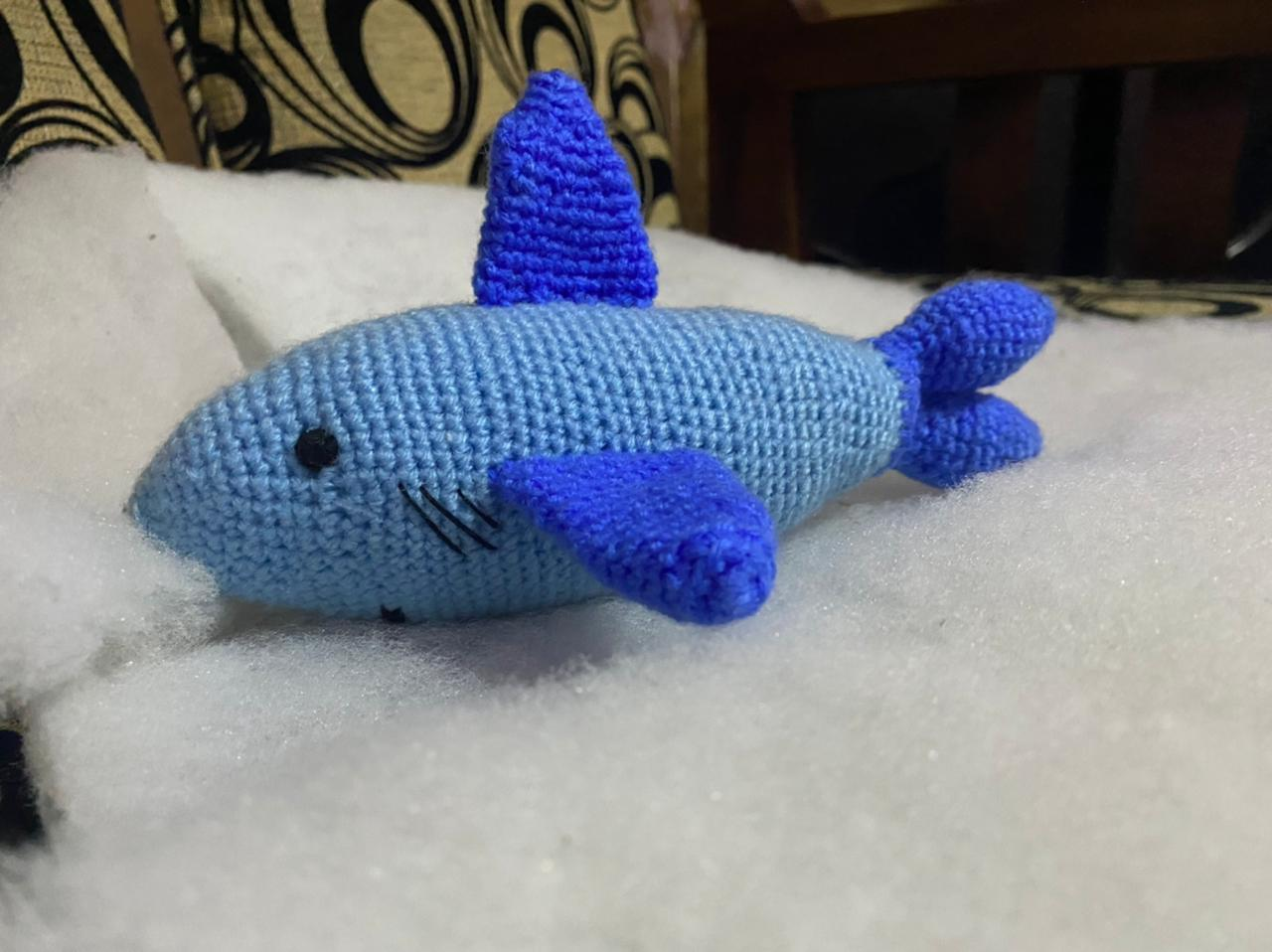 ඊට පස්සේ උඩ වරලයි දෙපැත්තෙ වරල් දෙකයි වෙන වෙනම පිටුපස කොටස ගොතපු පාටින්ම ගෙතුවා. අන්තිමට කරේ අදාළ ස්ථාන ලකුණු කරලා ඒ කොටස් 3 ඇඟට සම්බන්ධ කරපු 1. ඊටත් පස්සෙ මාලුවට කටකුයි ඇස් දෙකයි කළුපාට නූල්වලින් මැහුවා. මං හිතන්නේ මේ මාළුව හිතුවට වඩා කියුට් විදියට ආවා. හරියට මං වගේ.