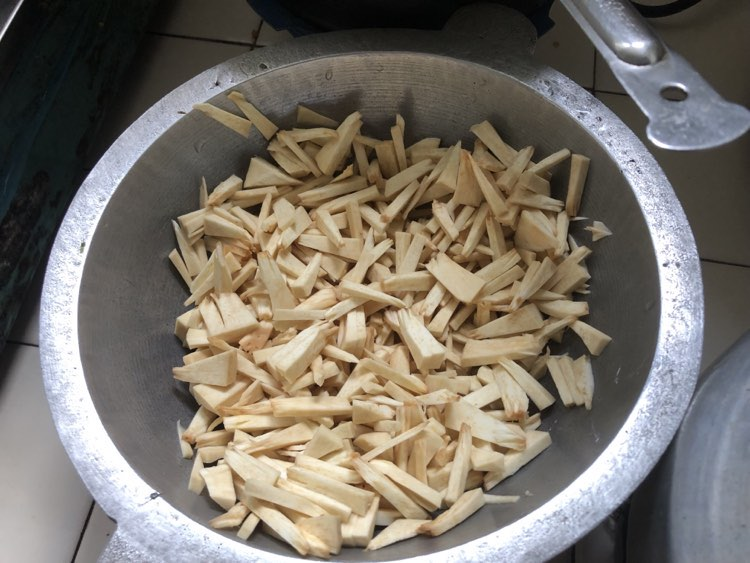පළමුවෙන්ම දෙල්ගෙඩිය මම පහලින් පෙන්වා දී ඇති පරිදි පුංචි තීරුවලට කපා ගන්න. කහට පිපෙන නිසා කහ පොඩ්ඩක් අත ගාන්න අමතක කරන්න එපා.