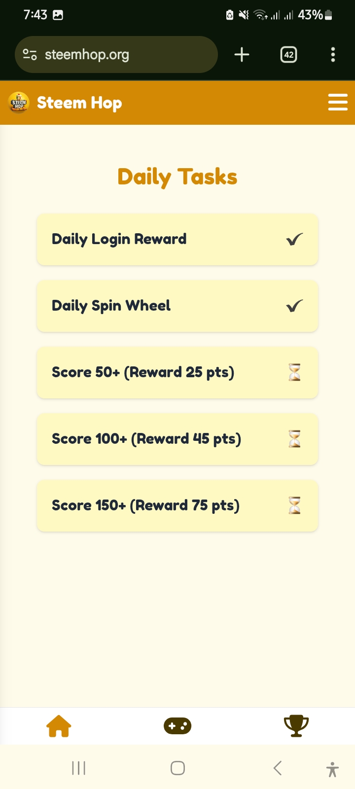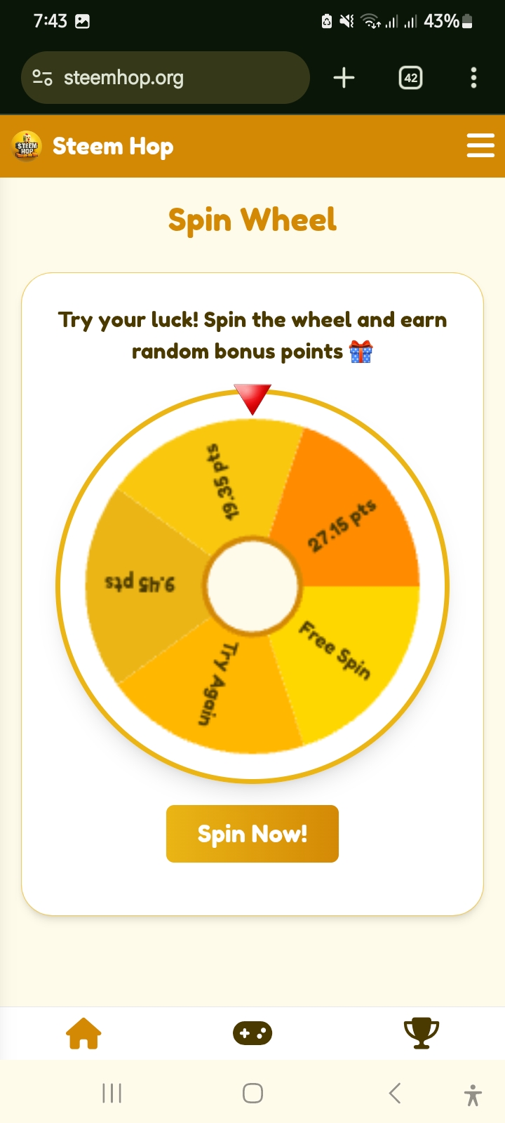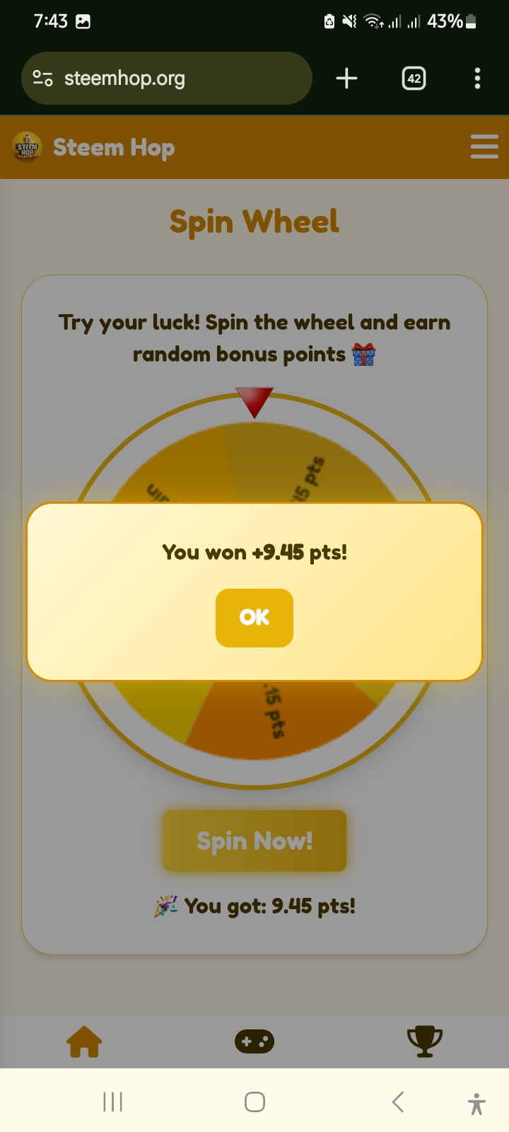 Now I went to the Steem hop games screen option. There is a chance to spin once every day. I completed today's activities and earned 9.45 points.