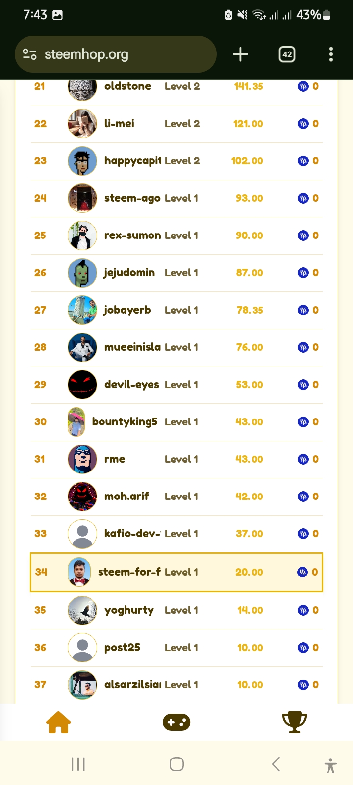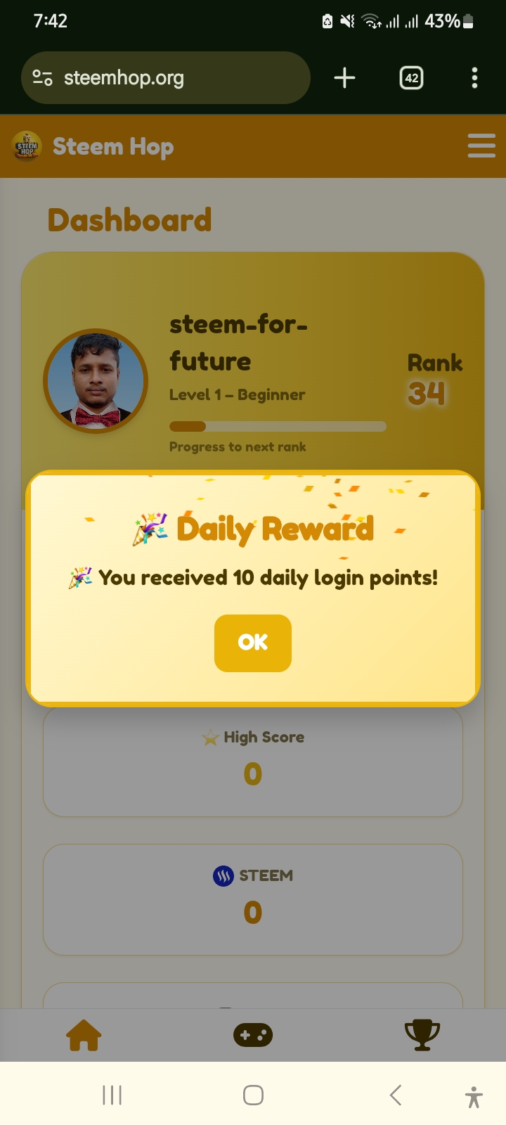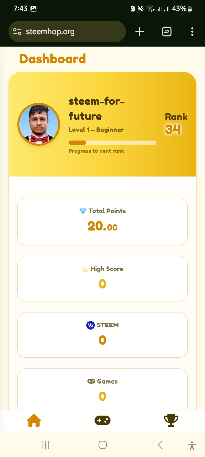 I first entered Steem Hop games through the website. After entering, I was given a 10. Bonus as an entry. This was a really good activity for me and I reached the main dashboard.