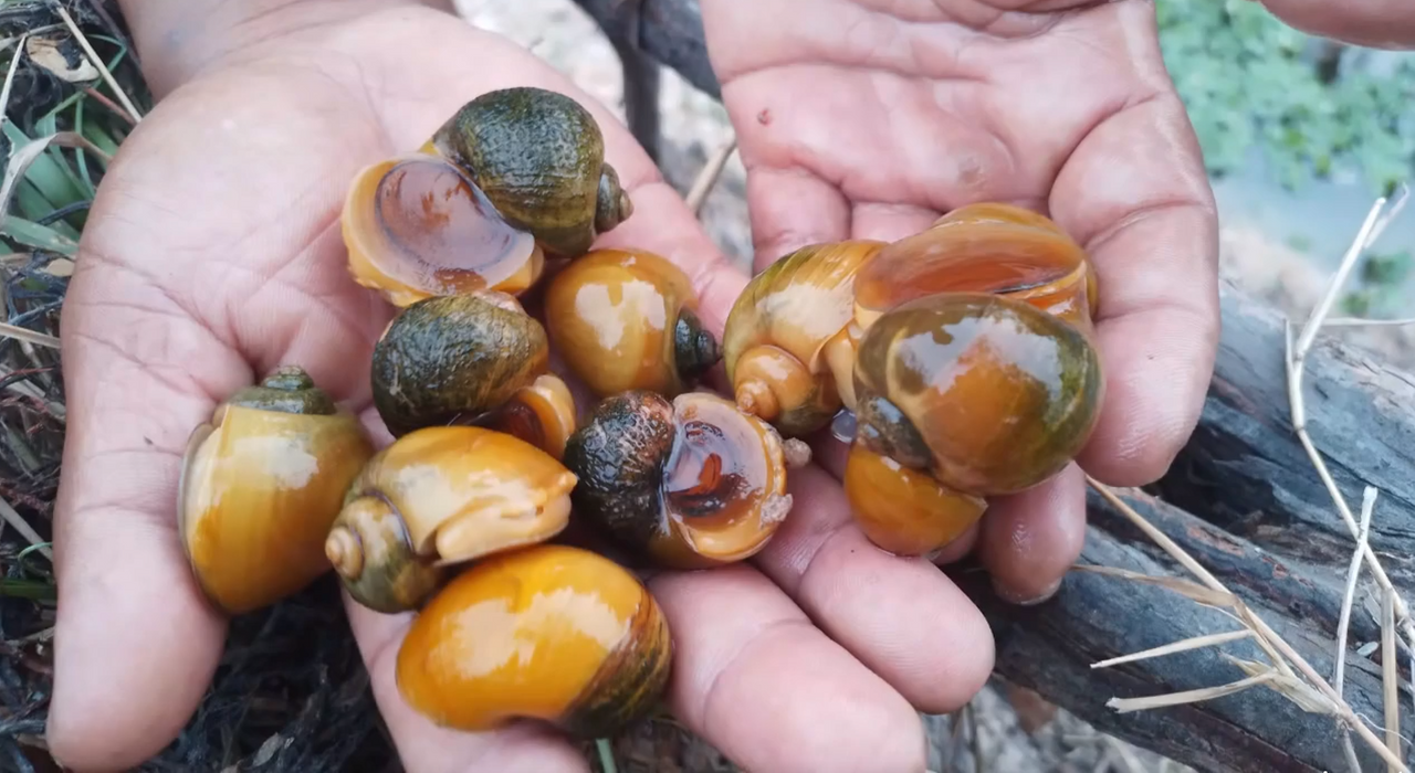 Cherry snails can be divided into 2 groups, those with yellow-brown shells. yellow flesh and mustache and they have a dark green and black bark with a faint black stripe along its length. light brown flesh and whiskers Golden apple snails grow and multiply quickly. Young mollusks are only 2-3 months old. They can pair and breed at any time. 1–2 days after mating, females lay eggs at night. By crawling to lay eggs in dry places above the water, such as on the branches of the grass by the water. at the base of trees by the water, beside the ridges, and along the rice fields The eggs are pink, clinging together in groups 2–3 inches long, each group consisting of 388–3,000 small, beautifully arranged eggs. The eggs hatch into mollusks within 7–12 days after laying.