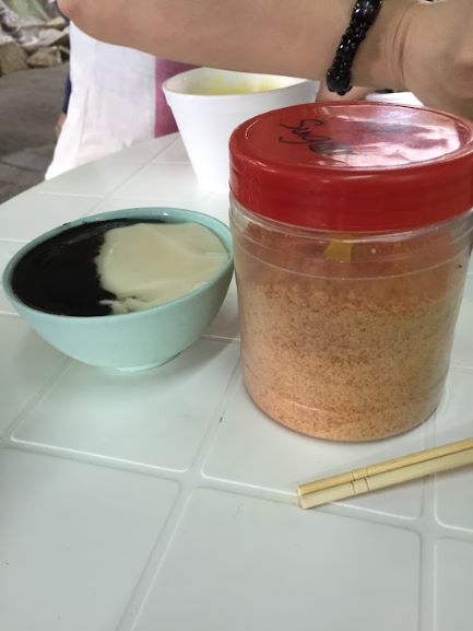 นี่เลยค่ะเต้าฮวยงาดำ มีโหลน้ำตาลตั้งให้บนโต๊ะอยากใส่มากใส่น้อยตามอัธยาศัย เพื่อนๆ เห็นแล้วนึกถึงอะไรคะ ? ก่อนกินก็โรยน้ำตาลคนทุกอย่างให้เข้ากันจากนั้นก็ใช้ช้อนตัก มันไม่มีน้ำขิงแบบเมืองไทย รสชาติก็อร่อยดี อธิบายไม่ถูกของแบบนี้ต้องลองด้วยตัวเอง