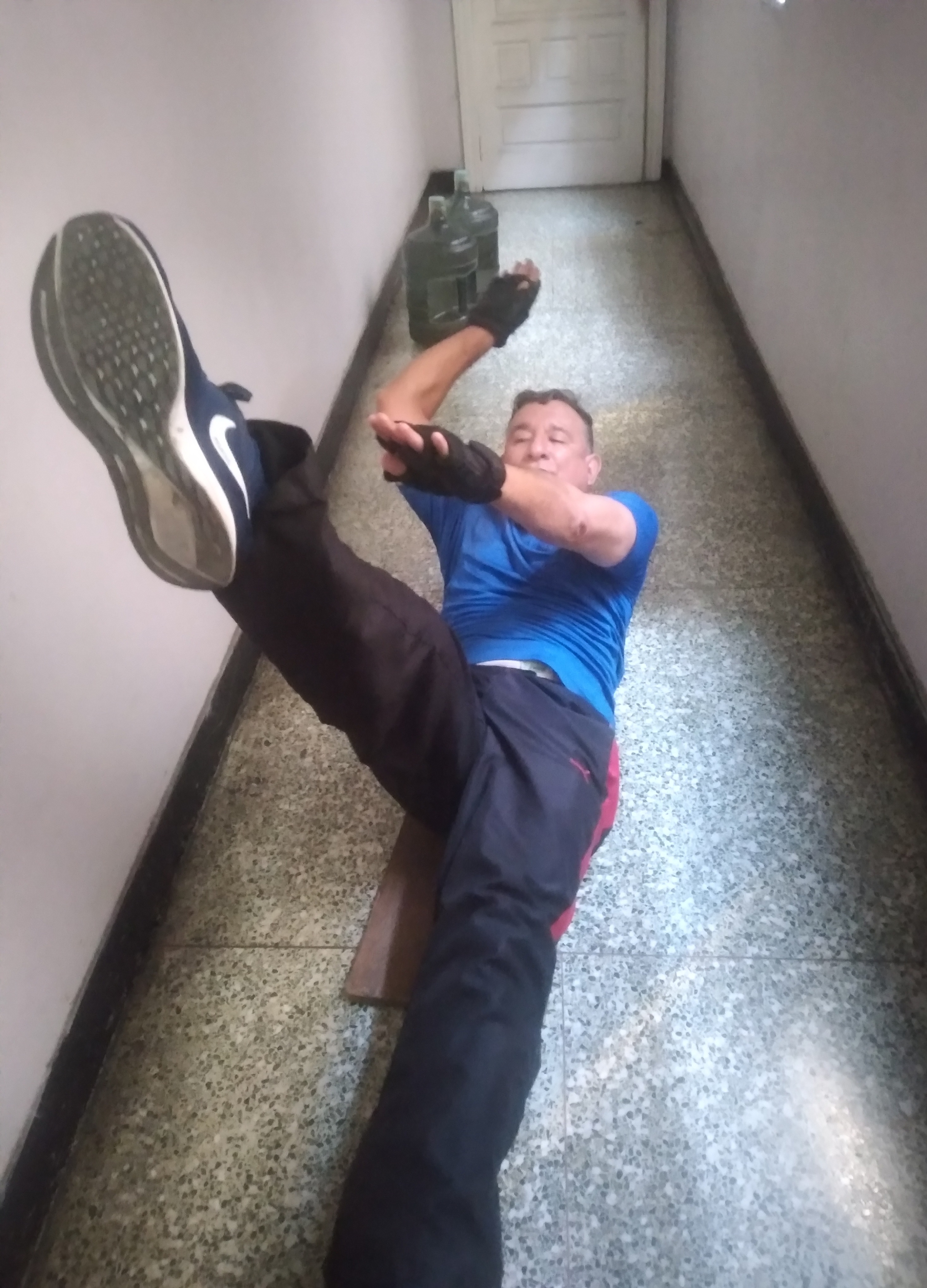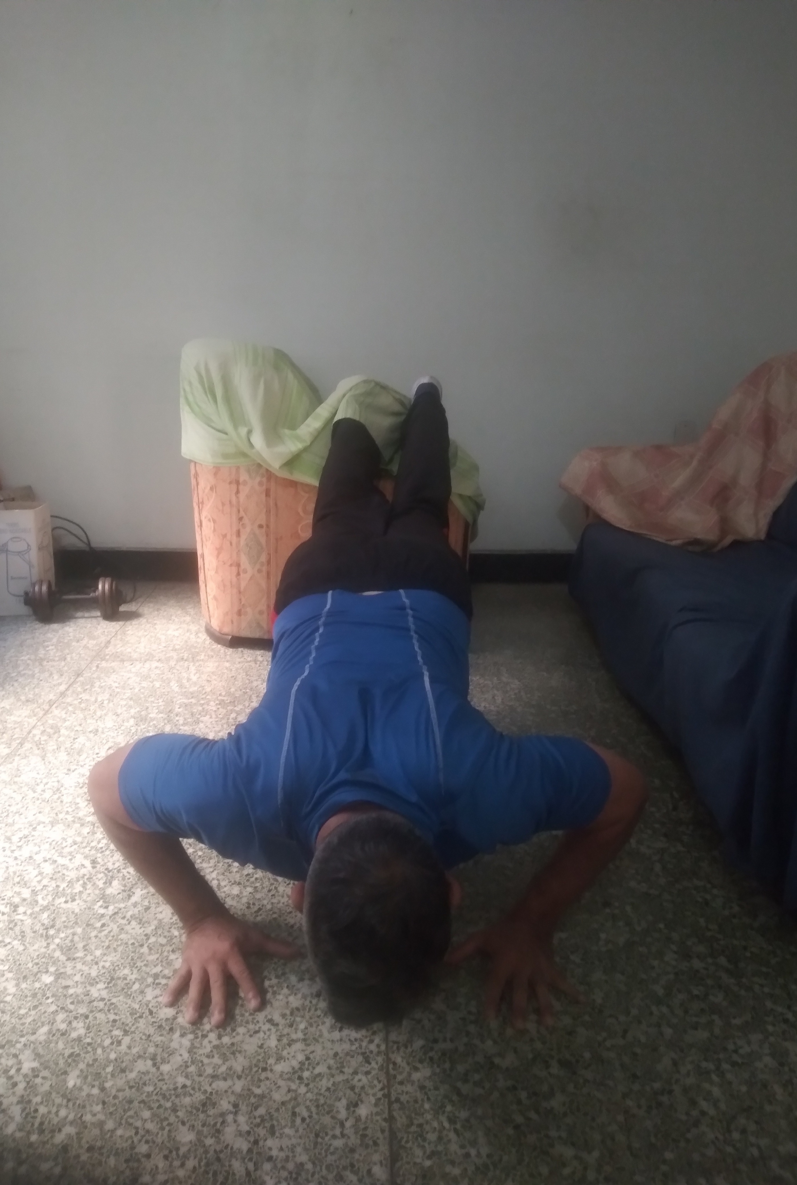 Después seguí con trabajo para pectorales, lo hice apoyando las piernas en el muebles para intensificar el esfuerzo durante la realización del ejercicio. Hice 6 series de 20 repeticiones