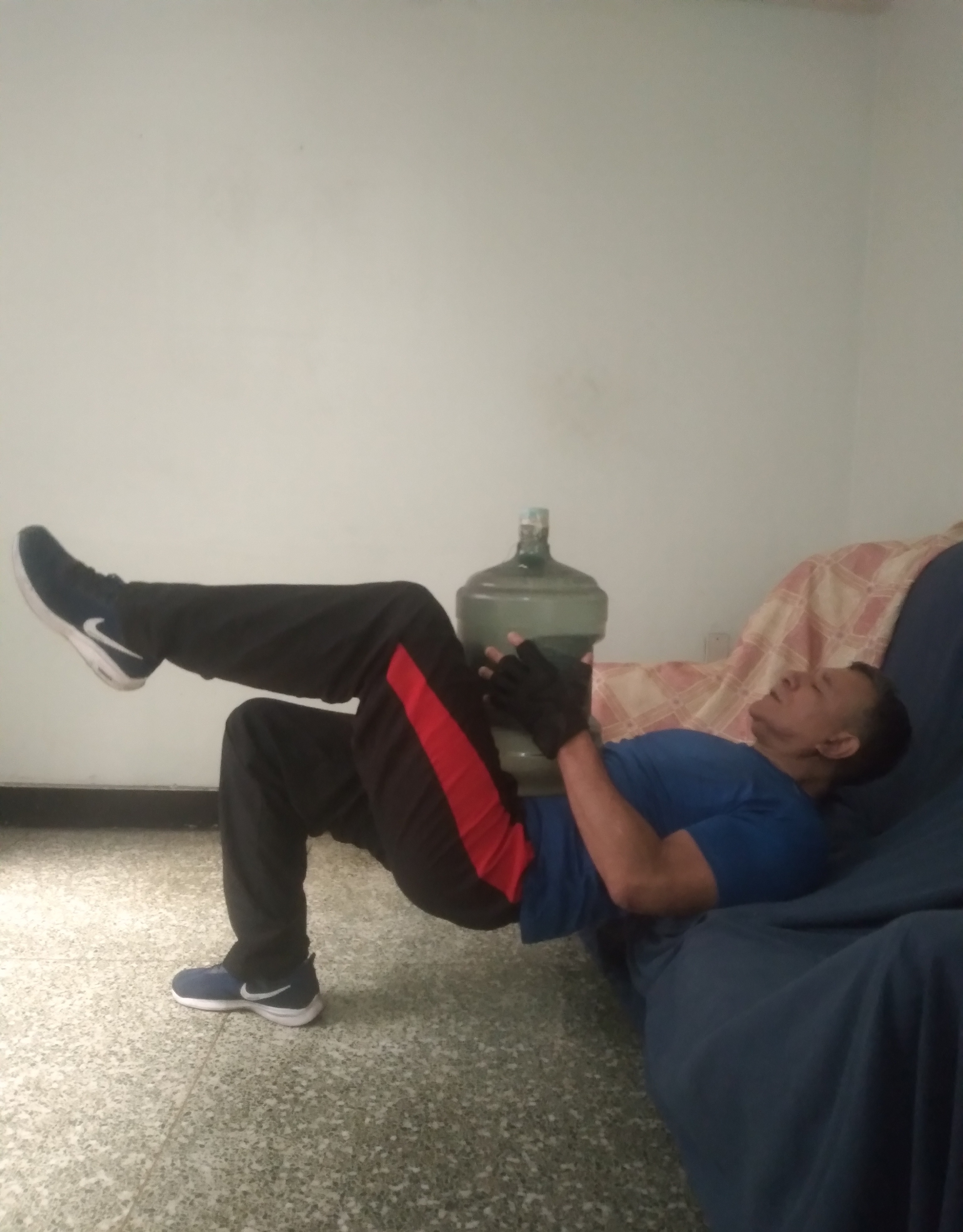 El primero fue Squats de glúteos, lo realicé con los botellones entre las piernas y doblando lentamente las rodillas. Hice 4 series de 16 repeticiones.