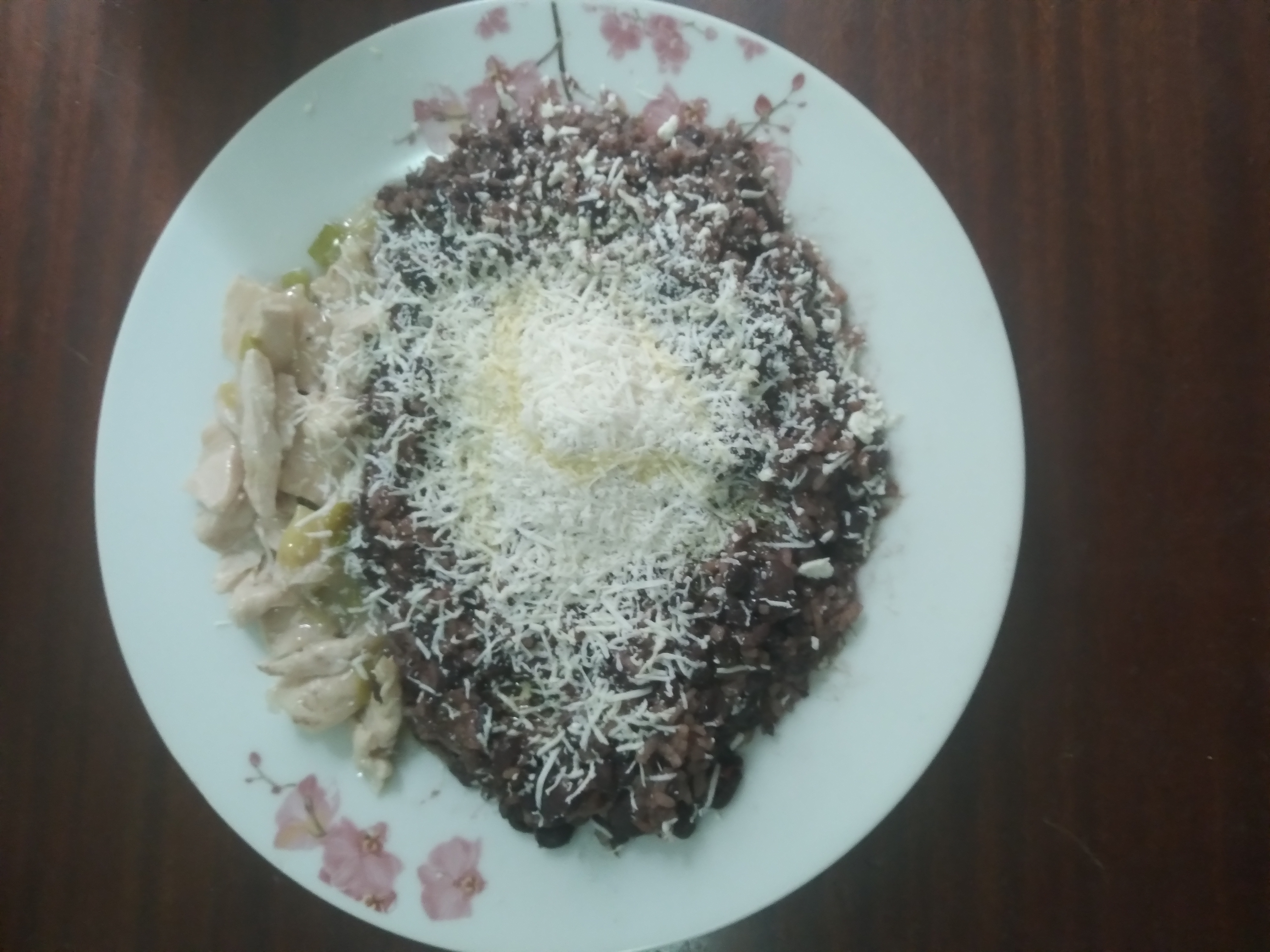 Mi esposa me sirvió el almuerzo a la 3:50 de la tarde, el cual consistió en unas ricas caraotas con arroz, un toque de aceite de oliva y quesito blanco acompañadas con pollito con cebollín.