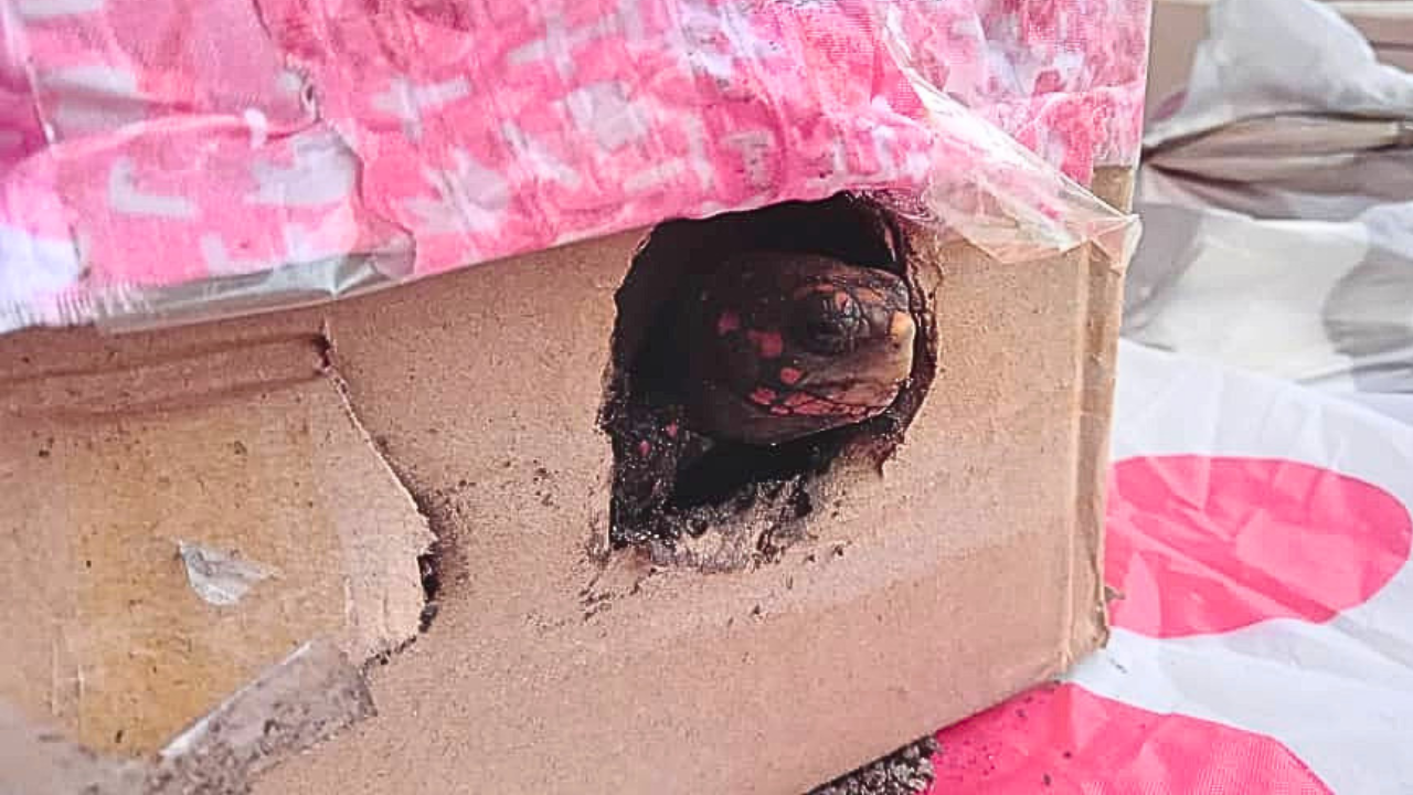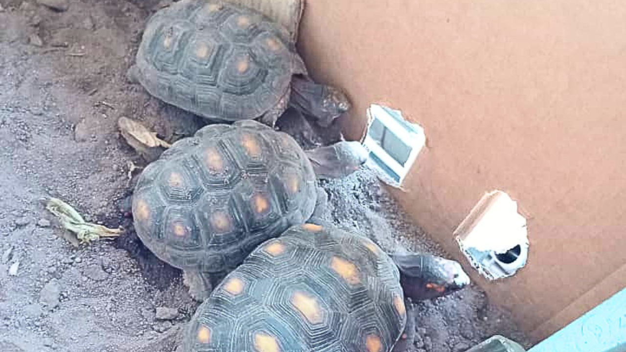 Cuando llegó el momento en que su cuidador se alejaba, mordió tenazmente el cartón para abrir un boquete logrando salir al patio, emprendiendo la huída más épica de su vida pero a paso de morrocoy...¡ni modo!