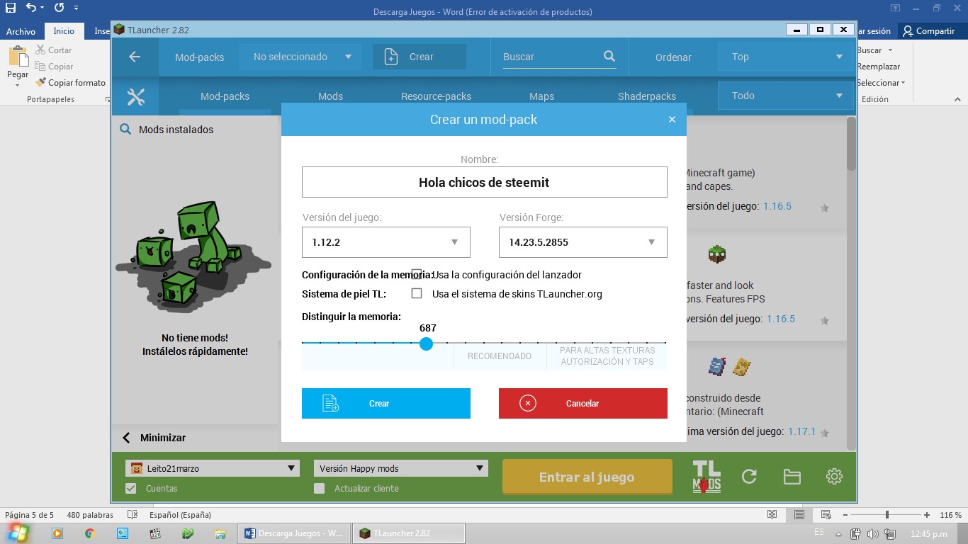 Ahora te voy a mostrar descargar los mods si te confundiste con lo de antes. Esto solo se hace con el tlauncher. Solo le tienes que dar al botón que dije antes y si se te olvido te digo que le des en tlmods y pondrá esta pantalla. Después le das donde dice crear.