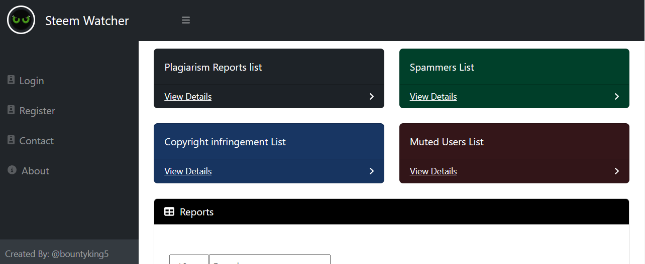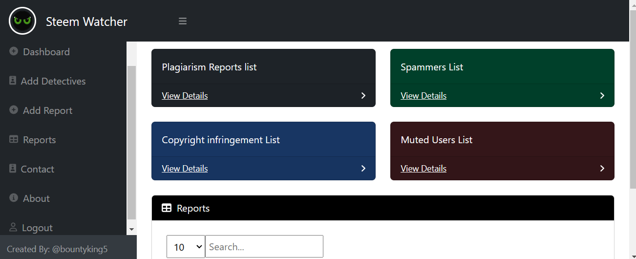 We are pleased to announce that finally we build our own official web portal to maintain the data. Record management is very necessary to highlight and catch the scammers. we welcome to all detectives on it. Please make their account on http://steemwatcher.com/ and inform us on discord to with their username to give the detective role. Detective role will give you the authority to edit and delete your reports. It is necessary to add their reports on steemwatcher portal to maintain reporting data. This project is created under the supervision of @rme.
